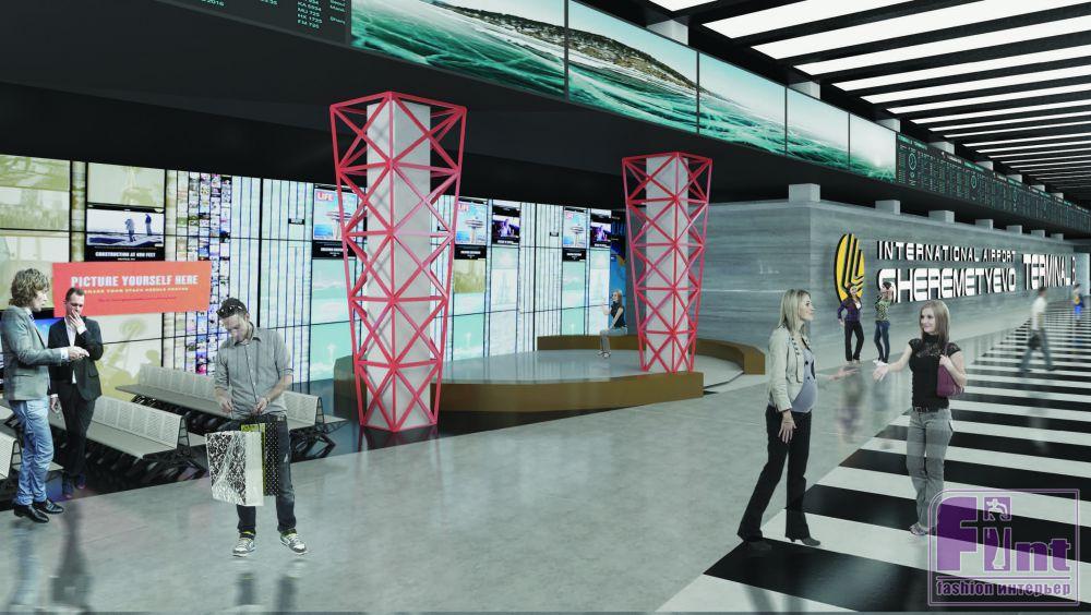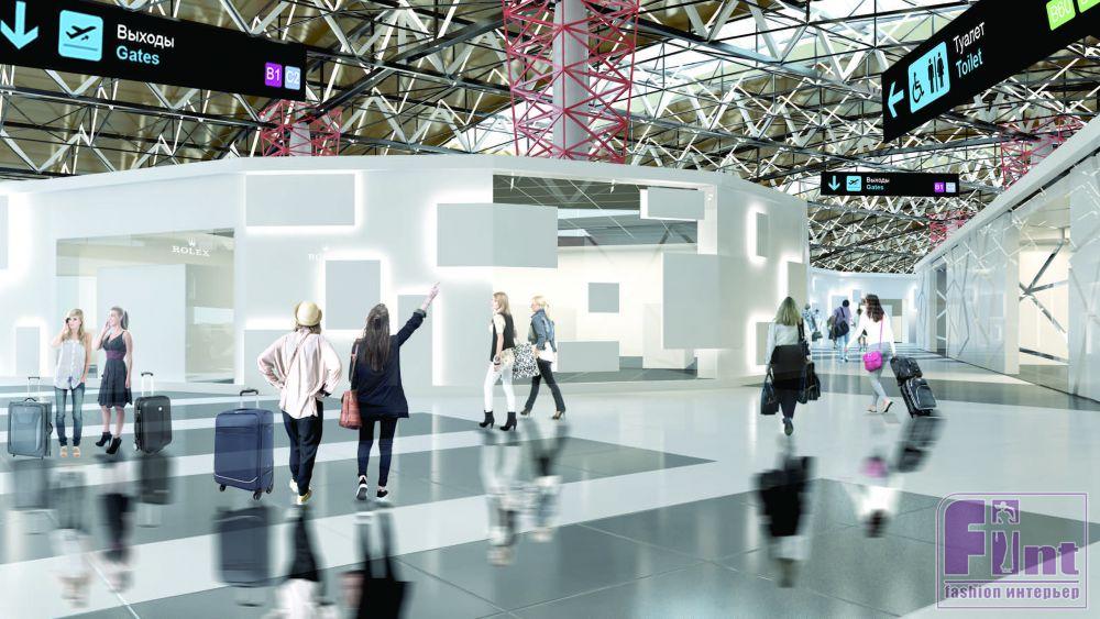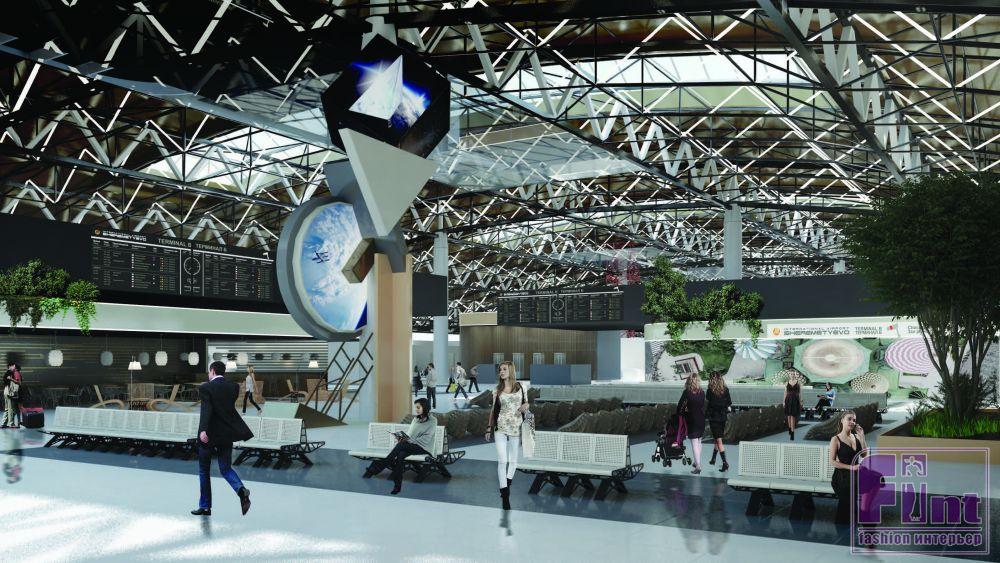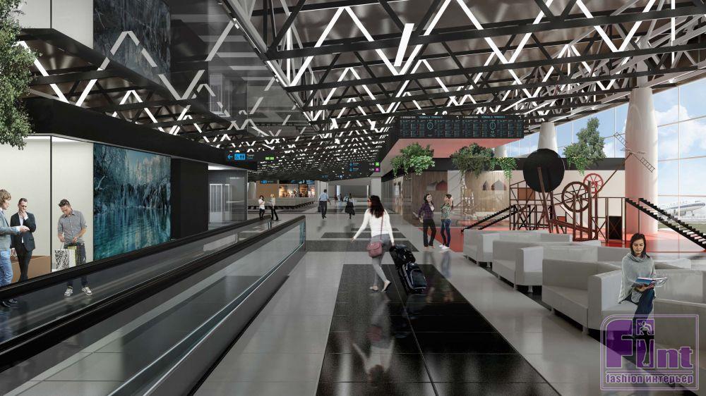 Специалисты RMJM разработали оформление для общественной зоны площадью 55,9 тыс. кв. м. Пространство будет разбито на три уровня и включит в себя вестибюль, зону получения багажа, зал вылета, пирс и зону магазинов Duty Free.