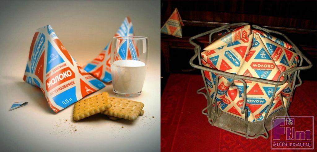 «Треугольный молочный пакет — не полностью советское изобретение. Линии для такой упаковки в СССР поставляла шведская компания Tetrapack. В 1943 году лаборатория Åkerlund & Rausing начала разработку картонной упаковки молока, в 1944-м Эрик Валленберг, молодой ассистент, выступающий как глава исследовательской лаборатории, изобрёл упаковку в форме тетраэдра, образованную из конусообразного куска бумаги. Тем не менее, эта форма пакета ассоциируется именно с СССР, ведь в Союзе он существовала десятилетия, и в такой упаковке выпускалось не только молоко, но и целый ряд других молочных продуктов. А для транспортировки и хранения русские даже изобрели специальную, геометрически выверенную тару из проволоки, а затем из пластика, в которой эти упаковки-пирамидки укладывались невероятно компактно – великолепный пример конструирования, воплощённый без применения современных 3D технологий и компьютеров».
