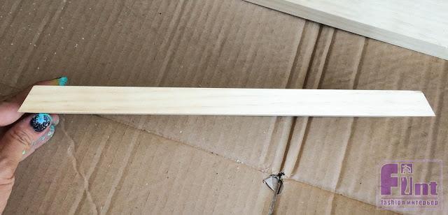 Для начала нарежьте деревянные заготовки нужных размеров. От длинной 2,5-метровой рейки отрезаем 3 детали длинной 635 мм каждая с углами в 30 градусов на концах, чтобы получить потом форму равностороннего треугольника. От короткой рейки отпиливаем 4 детали длиной 59 см, 42,55 см, 29,2 см и 16,5 см, также с углами 30 градусов. Размеры «полочек» являются ориентировочными. Если хотите, вы можете самостоятельно разметить треугольную раму, чтобы в неё можно было вставить 4 полочки на равных расстояниях друг от друга.