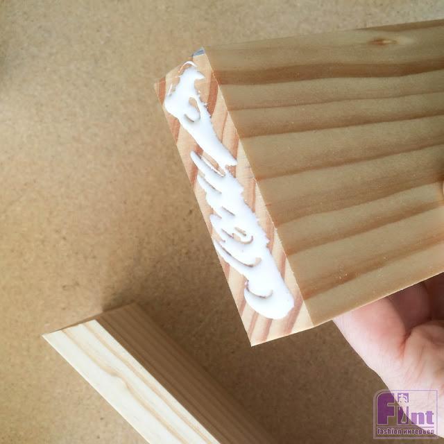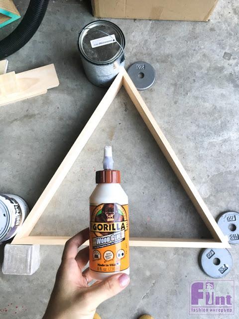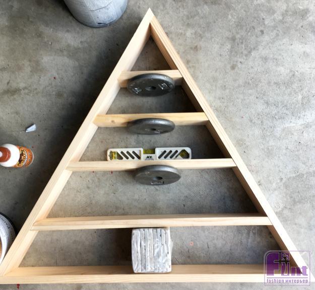 Когда заготовки подготовлены, склеиваем три равных заготовки по углам надёжным клеем, чтобы получить форму треугольника. На места склейки поставьте что-нибудь тяжёлое, чтобы клей лучше схватился. Оставьте полочку высыхать на всю ночь.