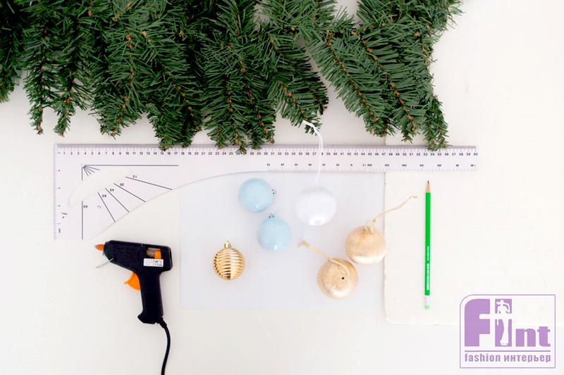 Для изготовления такого прекрасного панно с украшенной ёлочкой вам понадобятся: искусственные сосновые ветки; фанера или небольшой лист МДФ размером 60х80 см; пистолет с горячим клеем; ёлочные украшения маленького и среднего размера; линейка; карандаш; мягкая, сохраняющая форму проволока (медная, алюминиевая и т.п.).