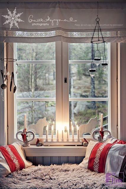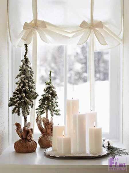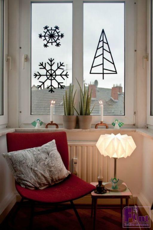 Нарисуйте на окнах морозные узоры. Для этого смешайте зубную пасту с водой, окуните в получившуюся смесь губку и промокните ею окна через бумажные трафареты снежинок. Если трафаретов у вас нет, можно просто стереть нанесённую губкой смесь из зубной пасты и воды тонкой палочкой, формируя стилизованные силуэты снежинок и морозных завитков. Не забудьте про подоконник, на который можно поставить массу новогодних и рождественских аксессуаров. Так, очень стильным украшением подоконника может стать подсвечник с несколькими свечами, расположенными в ряд в виде «горки».