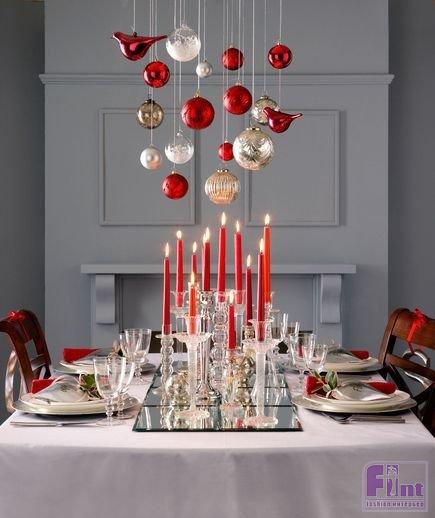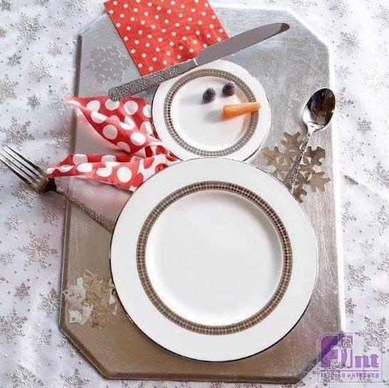 Как и ёлка, новогодний стол так же не должен быть перегружен различными аксессуарами. Постелите скатерть (желательно, чтобы она совпадала с базовым цветом оформления), расставьте красивую посуду. Картину дополнят свечи, новогодние венки, украшения из шишек и еловых веток. Не забудьте, что на столе нужно непременно оставить место для еды! Какой же Новый Год без оливье?!