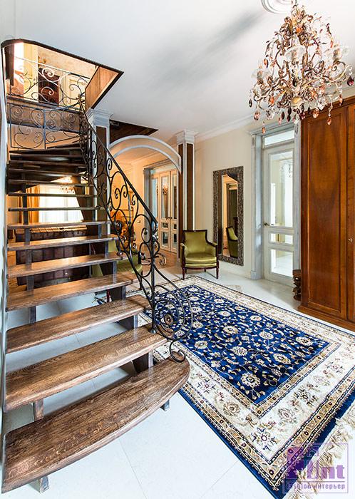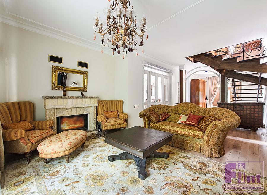 Да. Холл, который, кстати, по дизайну совсем не напоминает входную зону, плавно перетекает в гостиную-столовую, где пол выложен паркетом цвета белёного дуба, установлена замечательная мягкая мебель на резных ножках, и здесь же лежит великолепный ковер. Есть и традиционный дровяной камин с застеклённой топкой, и зеркало в массивной «золотой» раме, и, конечно, потрясающая хрустальная люстра, очень похожая на ту, что висит в прихожей.