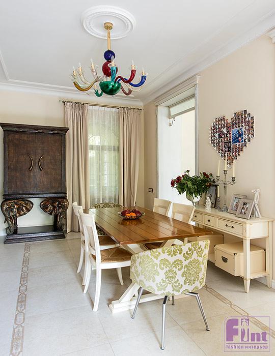 Столовая — наглядный пример эклектики. Здесь и современные дизайнерские кресла-стулья на металлических «паучьих» ножках, и люстра из цветного стекла ручной работы, и классическая белая консоль. Конечно, главная роль отведена «колониальному» винному шкафу. Надо сказать, что в доме немало такой «тяжёлой» мебели, например, журнальный стол с массивной столешницей или кресла у камина с высокими спинками.