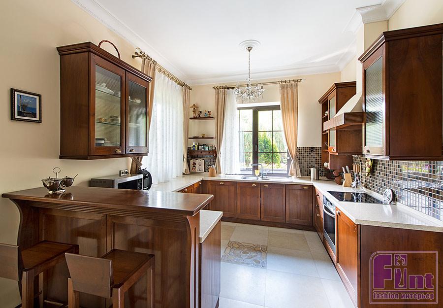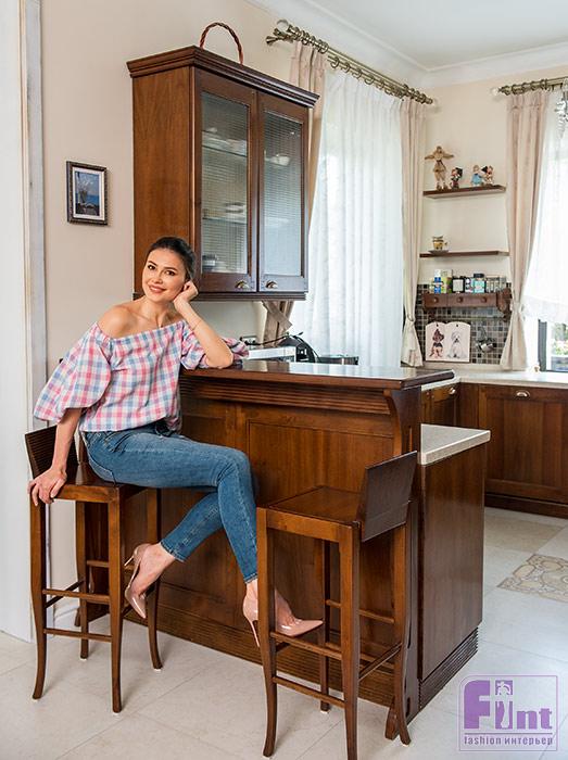 Далее следует кухня. Это для меня очень важное место, ведь я хочу, чтобы мои дети ели здоровую пищу, стараюсь придерживаться принципов правильного питания, и комфорт данной территории имеет значение. Несмотря на то, что гарнитур тёмно-коричневого цвета, кухня выглядит светлой: здесь два больших окна, подвесные шкафчики с застеклёнными дверцами, а на полу — светло-бежевый керамогранит.