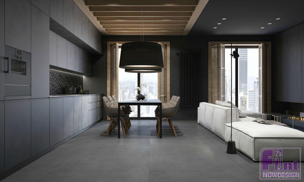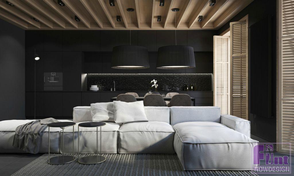Чтобы наполнить воздухом пространство, пришлось удалить перегородку между кухней и гостиной, объединив помещения. В общественной зоне кухню от гостиной разграничивает деревянный потолок. Саму кухню также выполнили в чёрном матовом цвете. Фасады кухни - чёрный матовый пластик. В качестве напольного покрытия дизайнер использовал крупноформатный керамогранит серого цвета.