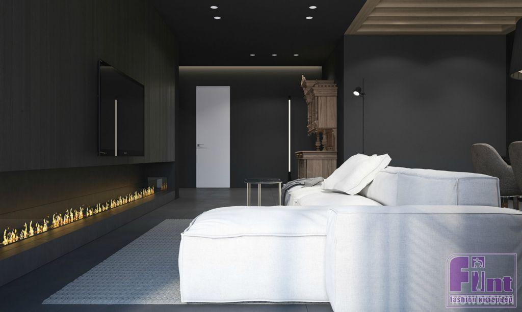 Станислав предложил нейтрализовать «ауру» черного «тёплой» отделкой, и этот ход прекрасно сработал. «Стены и потолок в гостиной мы окрасили в тёмно-серый, почти чёрный цвет, а дерево, которого немало в отделке, согрело и придало жизни минималистичному ритму интерьера», - рассказывает дизайнер.