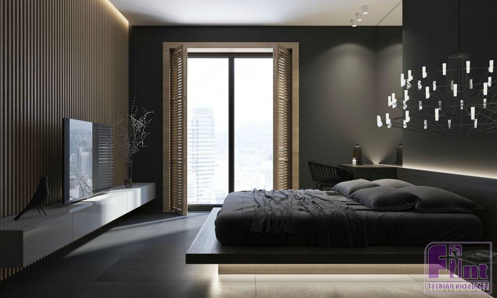 В спальне все стены также выкрашены в тёмно-серый. Желаемая теплота интерьера достигается благодаря эффектной подсветке и использованию деревянной фактуры в зоне просмотра ТВ. Каркас кровати с изголовьем и туалетным столиком выполнены на заказ. Также в спальне есть гардеробная комната со стеклянными стенами: стекло крепится на металлический каркас.