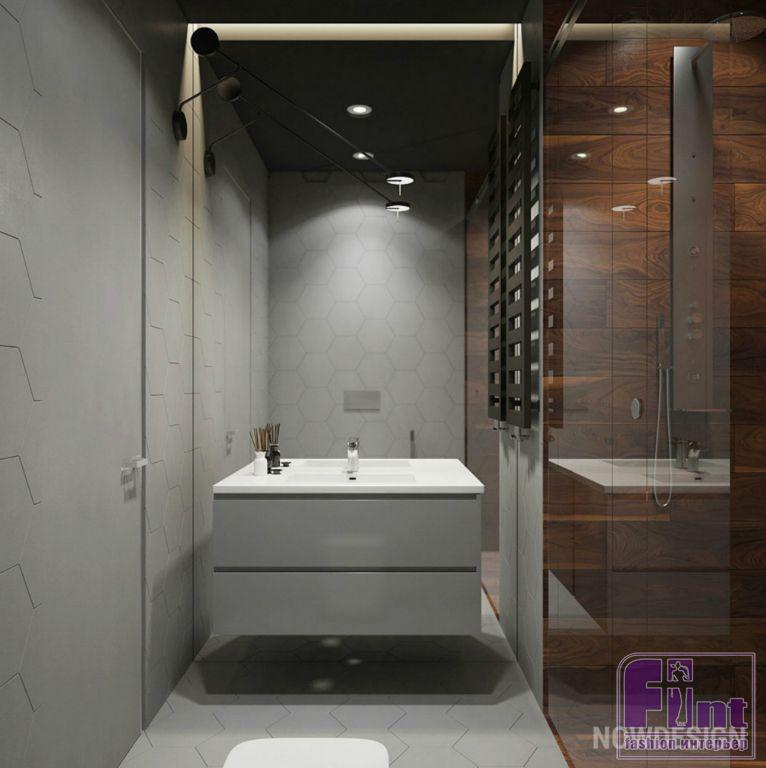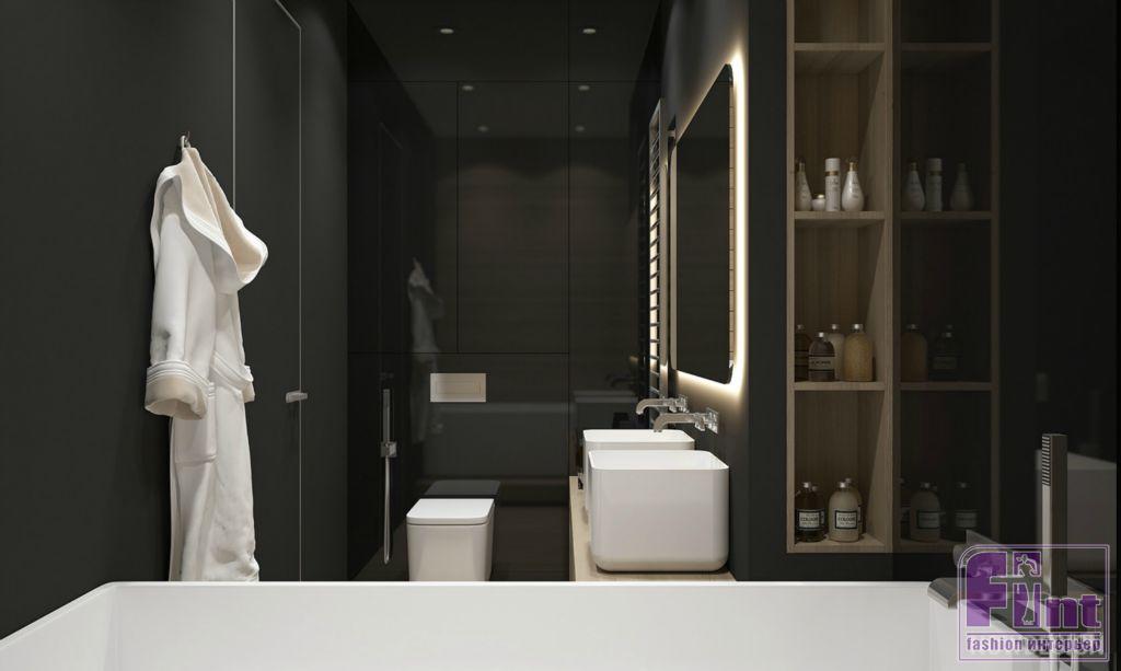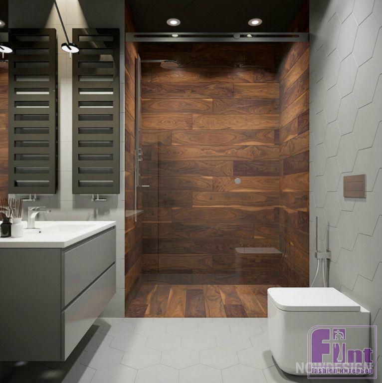В ванной, примыкающей к спальне, стены выкрашены в тёмно-серый цвет влагостойкой краской. Пол и стена около ванной отделаны доской для влажных помещений.