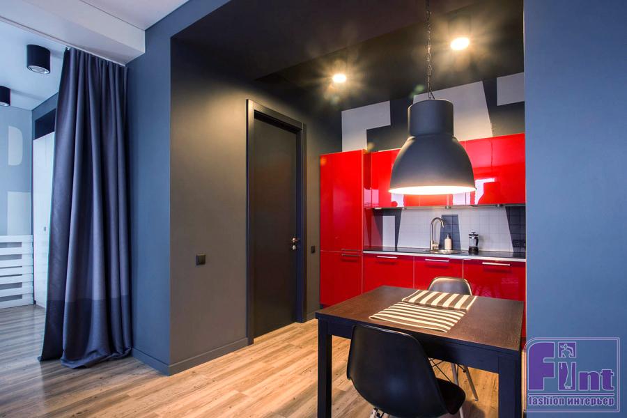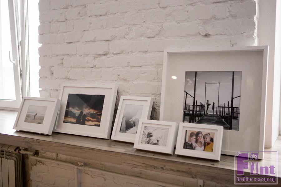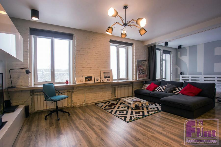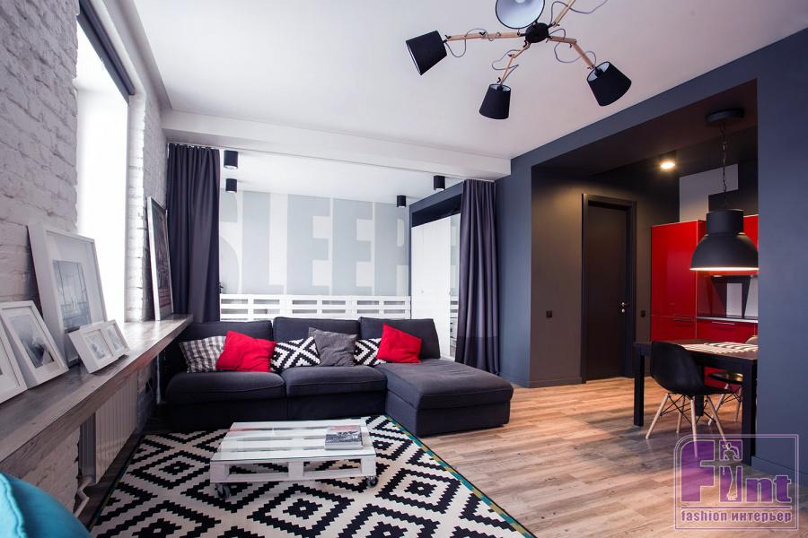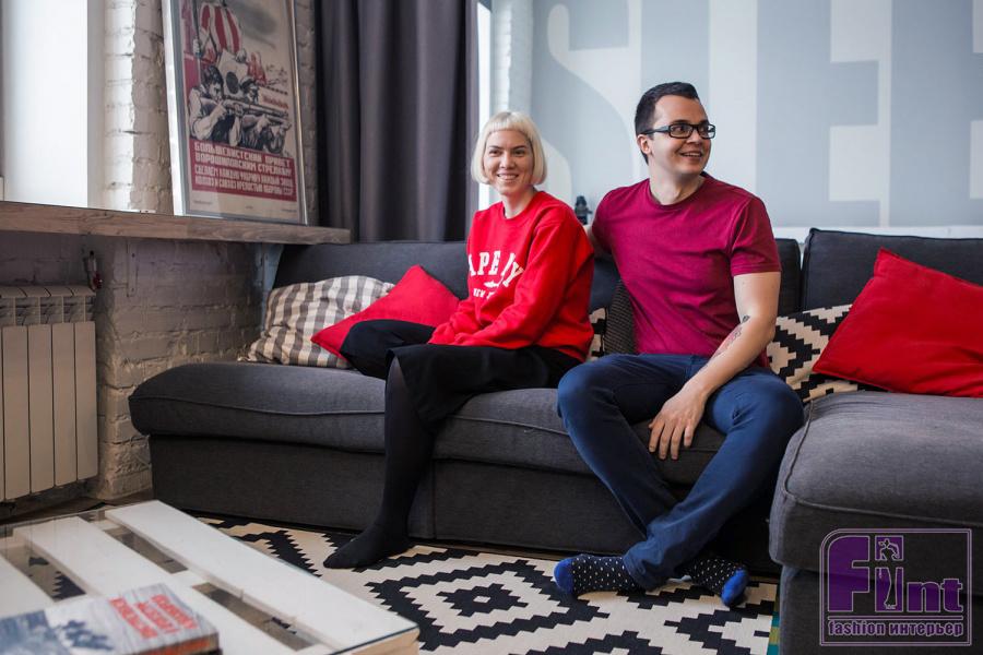 В отделке квартиры главным акцентом стала оригинальная кирпичная кладка. Она была очищена от штукатурки и покрашена в белый цвет. Прихожую и кухню для контраста выполнили в тёмных тонах, а ярких красок, соответствующих энергетике молодости, привнесли с помощью обычного кухонного гарнитура. Другая мебель, в основном, тоже была куплена в готовом виде, лишь кровать и журнальный столик Сергей смастерил своими руками из обычных транспортных паллет.