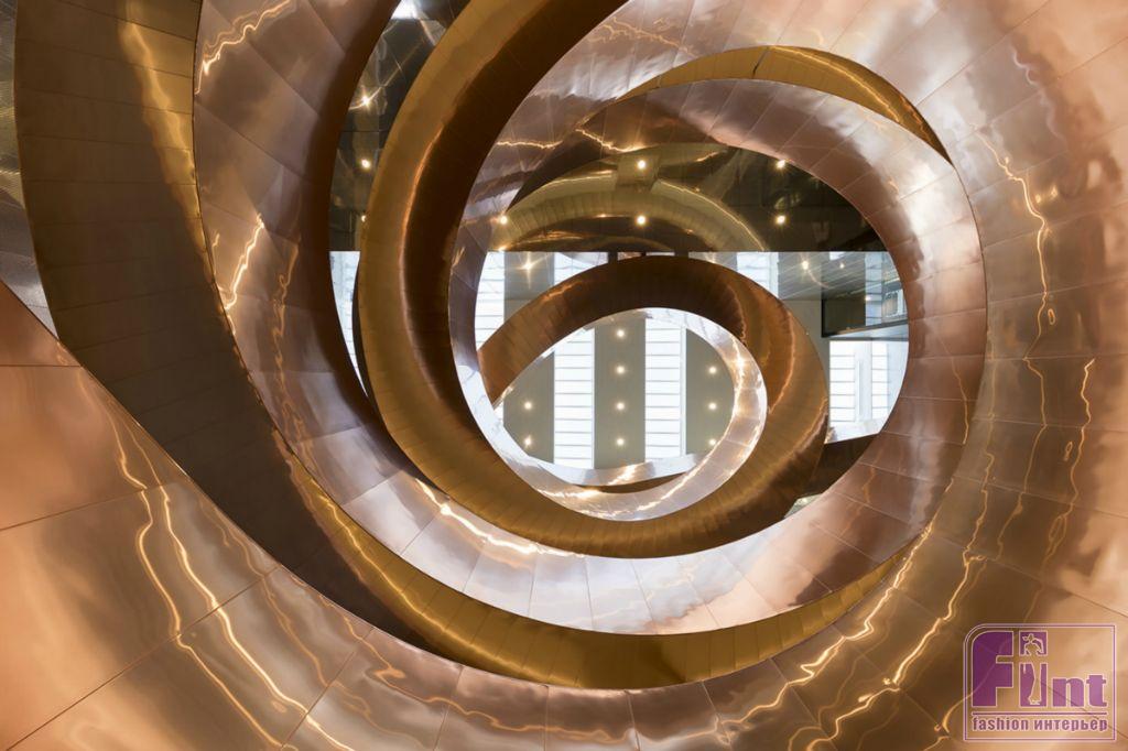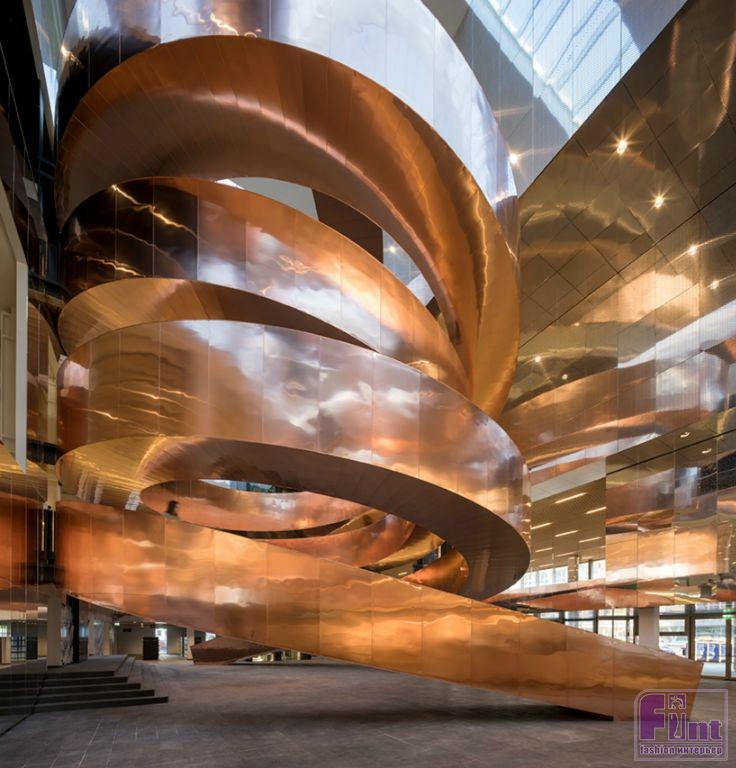 Лестница расположена в центре просторного атриума. Спиралевидная структура «встречает» посетителей при входе, а затем витками уходит вверх, объединяя все четыре этажа здания. Длина конструкции 100 м. На ее строительство ушло 160 тонн стали и 10 тонн меди.