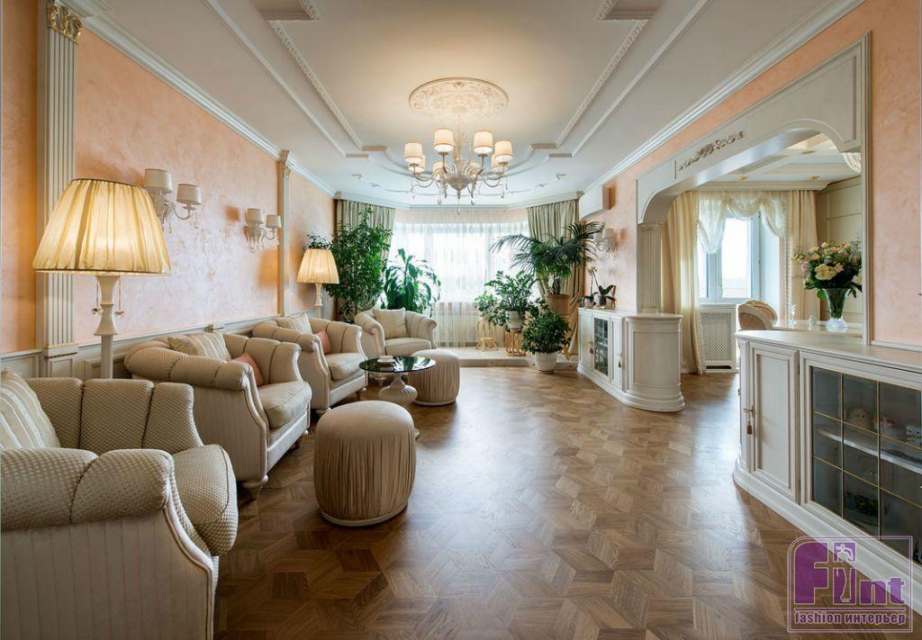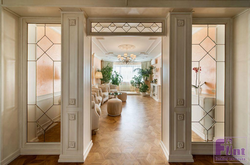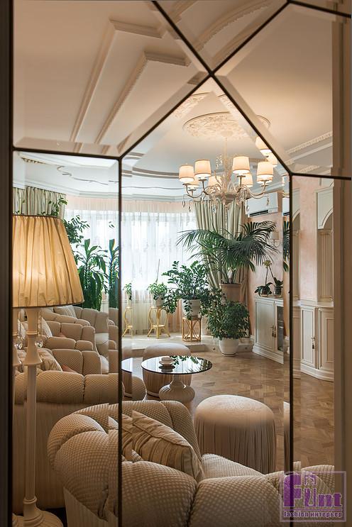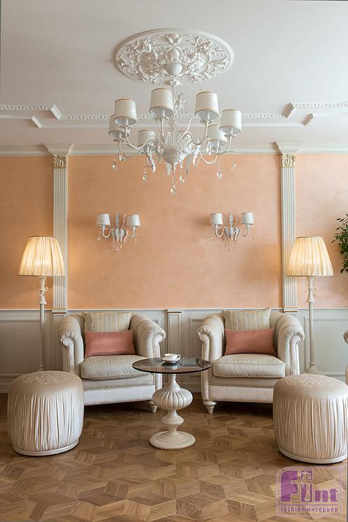 Действительно, уже в прихожей, выполненной в нежных персиковых оттенках, возникает тема сладкого кондитерского крема. Мотив «Дольче вита» продолжается в гостиной, где округлые пуфики и четыре кресла оттенка крем-брюле выгодно смотрятся на фоне терракотовых стен. Потолок украшен лепниной, что в сочетании с люстрой, бра и торшерами создаёт неповторимую атмосферу. Заказчица хотела наполнить холл естественным светом, поэтому автор проекта разработала стеклянный портал, выполненный итальянской фабрикой Bucalossi. Впрочем, и вся мебель в квартире - от известных итальянских производителей мебели.