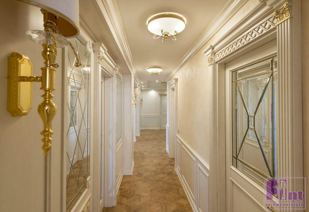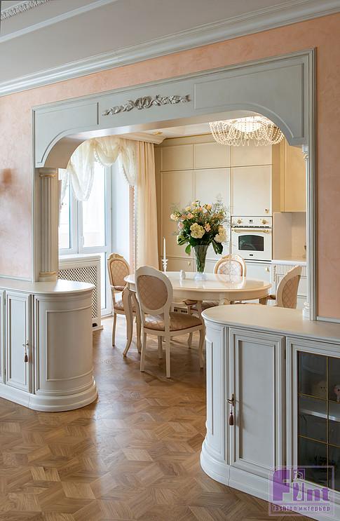 Кухню отделили от гостиной с помощью арки с дополнительными местами для хранения, разработанной автором проекта. Белая арка с золотым декором органично смотрится на фоне терракотовых стен и «янтарного» паркета.