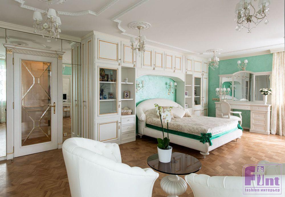 Стены спальни Марина предложила отделать декоративной штукатуркой мятного цвета. Такой выбор был сделан дизайнером неспроста. Фирменный рецепт семьи заказчицы заключается в добавлении в сладости свежей мяты, что и было подчеркнуто в отделке.
