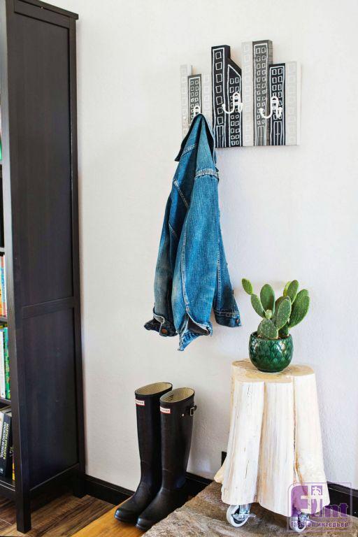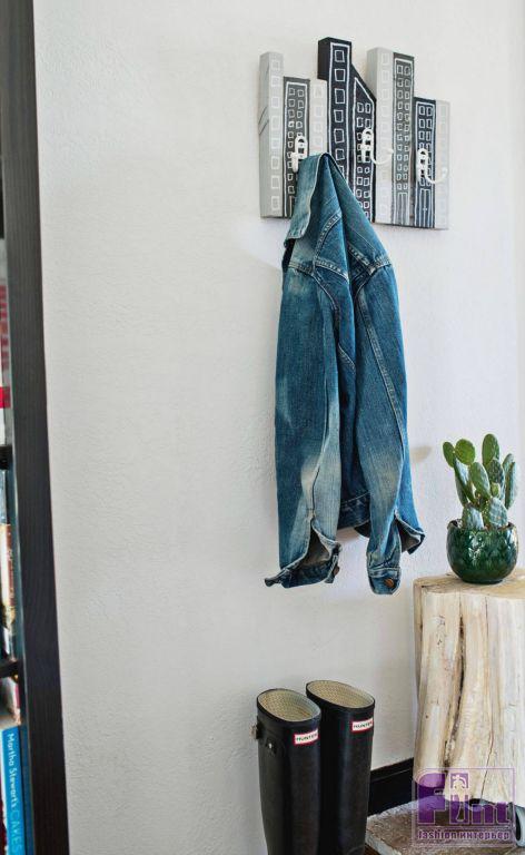 Вот и все! Это довольно простой DIY-проект из деревянных заготовок, который можно сделать буквально за пару часов. И в то же время, благодаря интересной идее, у нас получился очень стильный и весьма функциональный элемент интерьера. Лучше всего такая настенная вешалка для верхней одежды смотрится в прихожих с крашеными стенами, или со стенами, оклеенными фактурными стеклообоями под покраску.