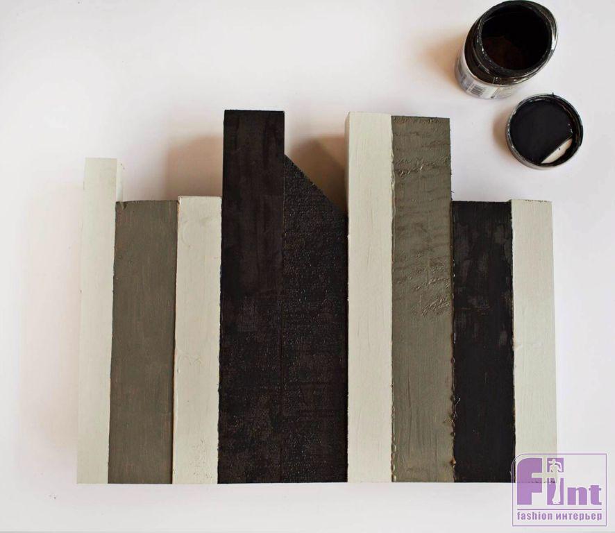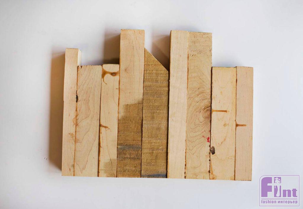 Шаг первый. Соберите наше панно из брусков так, чтобы у панно был ровный нижний край. При необходимости подпилите бруски, чтобы создать неровный верхний край, напоминающий здания в нашем городском силуэте. Кстати, пилить бруски можно не только под прямым углом. Отпиленные под острым углом бруски также отлично смотрятся в панно. Затем, после того, как вы подобрали «городской пейзаж», склейте все бруски вместе.
