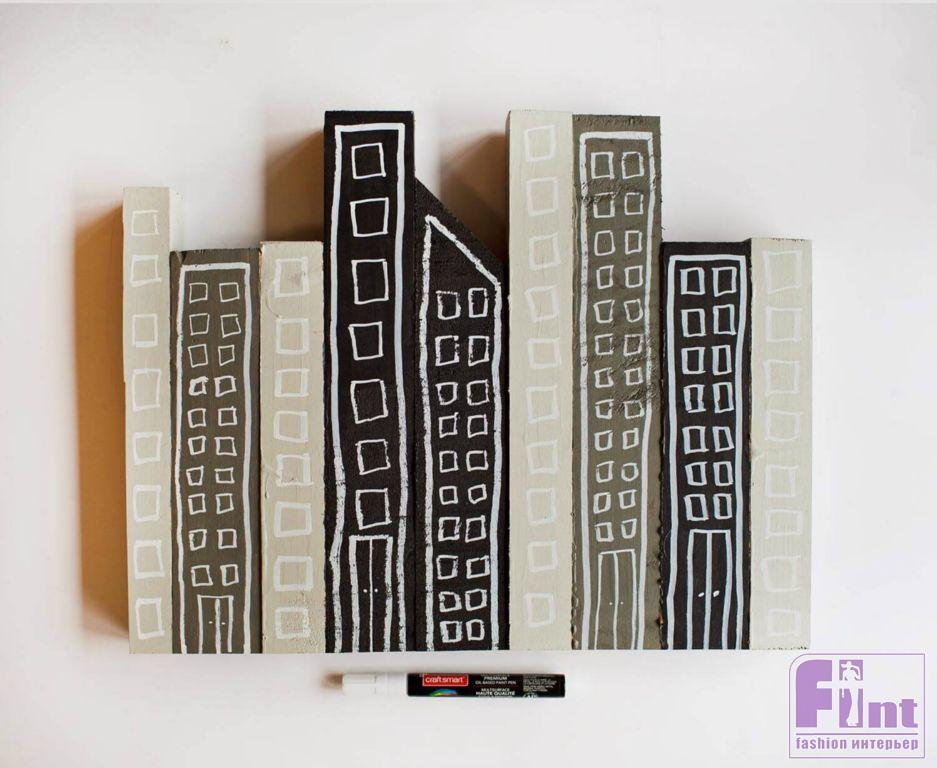 Шаг второй. Окрасьте бруски в три оттенка одного цвета, чередуя оттенки на соседних брусочках. После того, как краска высохнет, нарисуйте белым маркером окна, двери и контуры «зданий». Старайтесь не рисовать «по линейке» - чем менее аккуратно и схематично будут выглядеть окна и двери «домов», тем интереснее будет итоговый внешний вид вешалки. Для нашей вешалки мы использовали три оттенка серого, но вы можете выбрать краску того цвета, который подходит под ваш интерьер. Так, например, можно окрасить здания в оттенки бордового, лазурного или изумрудного. Главное, чтобы оттенки были в одном цвете, но достаточно сильно различались по тону и насыщенности (очень светлый, средний и очень тёмный).