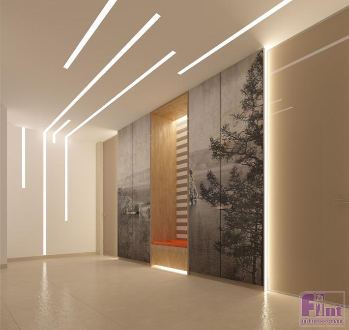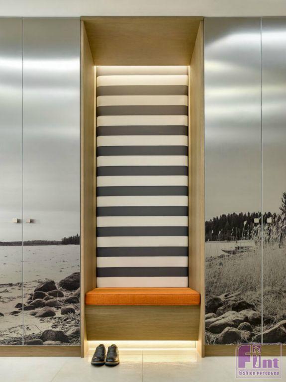 В прихожей особое внимание обращают на себя металлические фасады системы хранения. На плоскостях встроенных шкафов напечатаны пейзажные чёрно-белые фотоработы художника М. Блинкова. Аналогичное фотографическое решение оформления плоскостей мы видим и в гостиной – за оригинальным комодом установлена настенная панель из металла с нанесённым чёрно-белым фотопринтом.