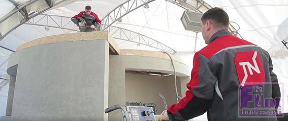 Отпечатанные стены не требовали выравнивания и были сразу готовы к чистовым работам. Для наружной отделки использовалась минеральная декоративная штукатурка с рисунком «короед». В её состав входят белый цемент и шарообразные мраморные и гранитные крошки, поэтому она может служить дополнительным утеплителем. После отделки штукатуркой дом покрасили в жёлтый цвет фасадной краской.