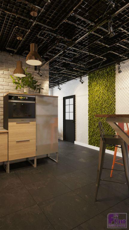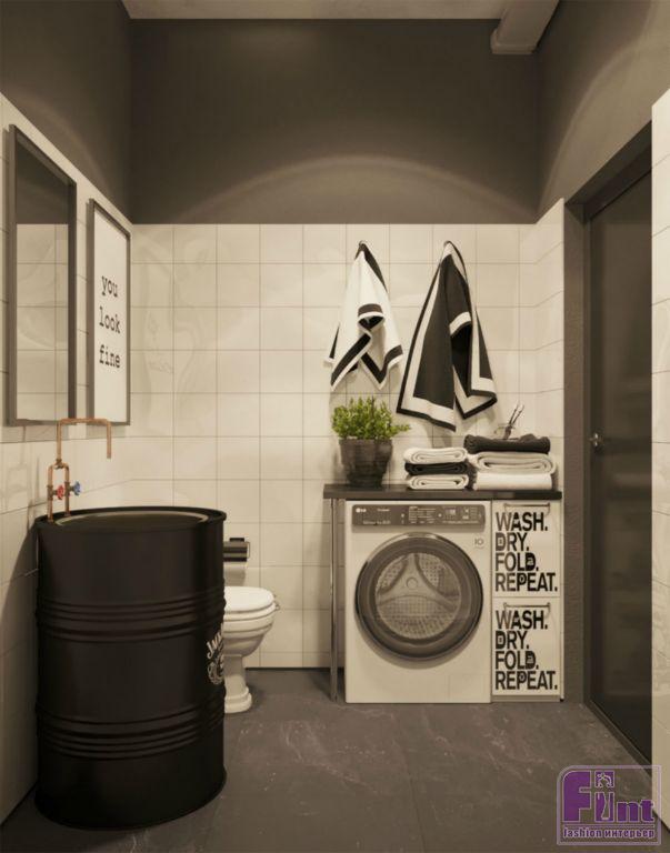 Тёмный потолок и белые стены визуально увеличили высоту квартиры, а общее колористическое решение объединило пространство. Основной акцент во всём проекте сделан на открытые коммуникации, трубы и металлические элементы потолка. Присоединённая лоджия стала кабинетом и рабочей зоной.