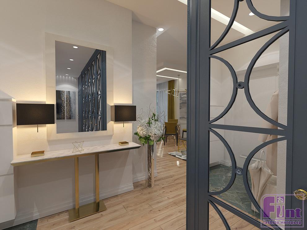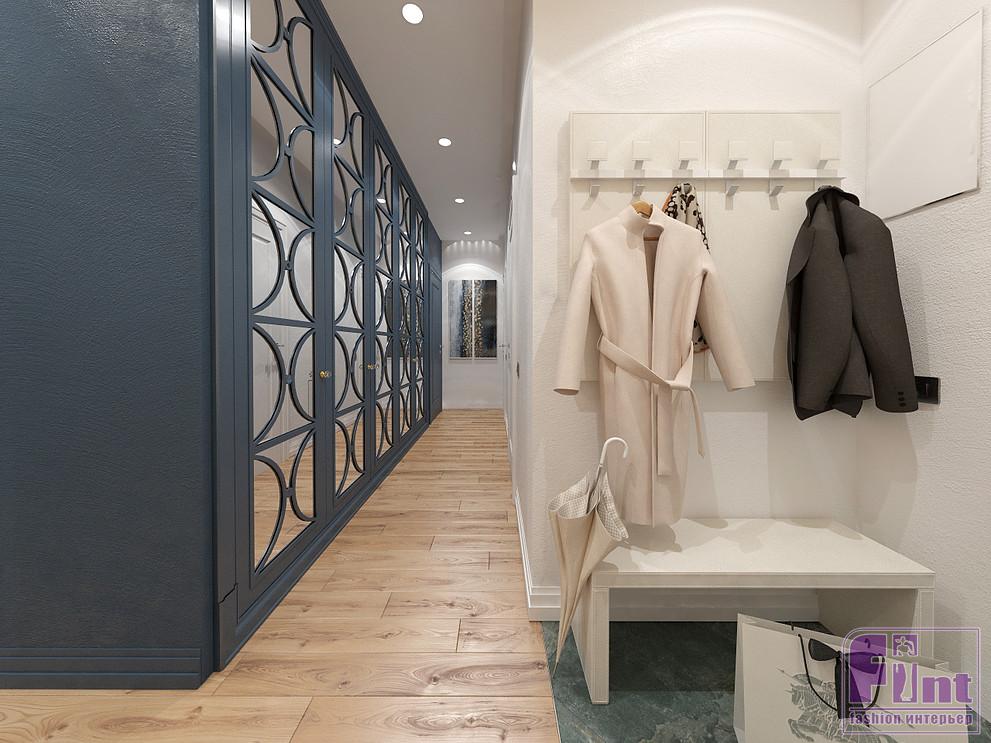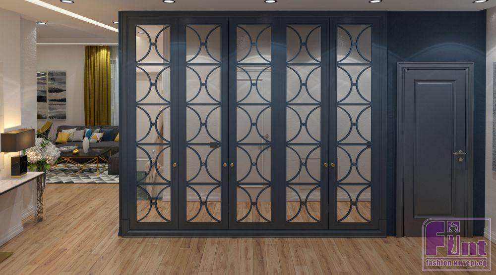 Выбранный оттенок хорошо подошел к синему цвету, любимому хозяевами. Синим окрашена стена в гостиной - в ней «спрятана» дверь в спальню, - а также стена в коридоре. Встроенный шкаф в коридоре с классическим узором и зеркалами также окрашен в цвет стен - синий. Этот же цвет сочетается с золотым в мебели и декоре. Шторы горчичного цвета в гостиной и «золотые» элементы мебели не позволяют синему цвету стены слишком «давить» на интерьер.