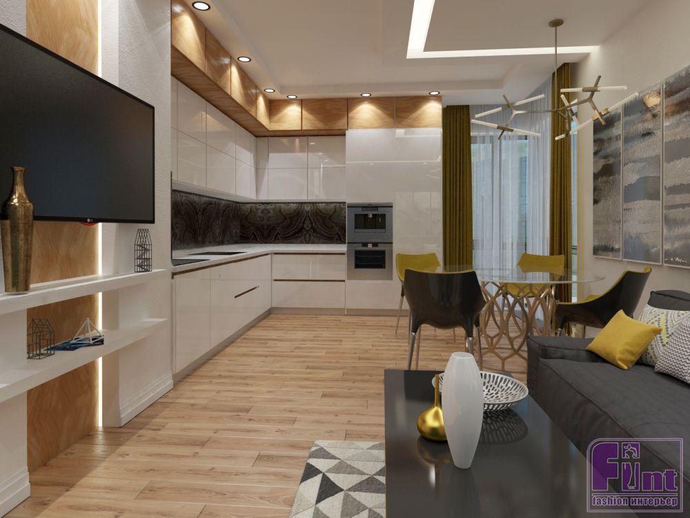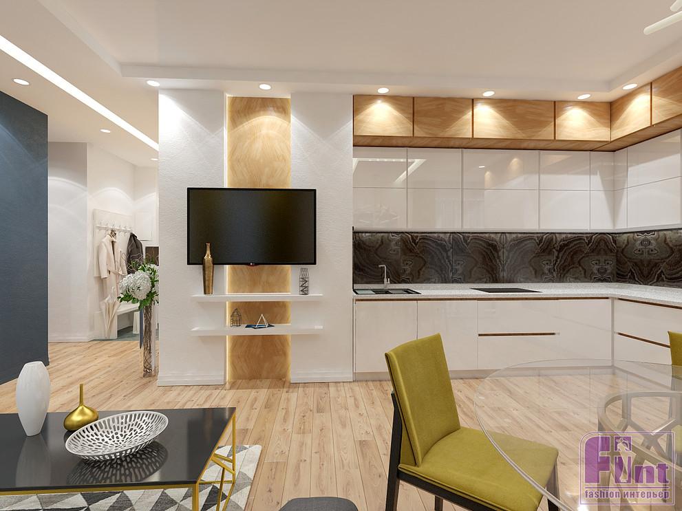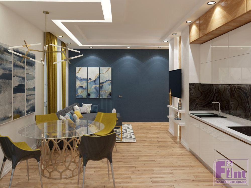 В кухне гарнитур «закрыл» угол до потолка, а рисунок верхних ящиков кубической формы повторяется в зоне ТВ. Ниша за экраном оформлена панелями из деревянного шпона. Картины с абстрактным изображением в сине-золотой гамме гармонизируют обстановку. В стене «спрятана» дверь в спальню хозяев.