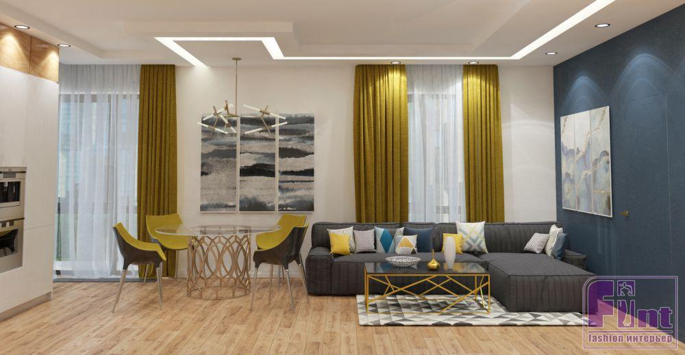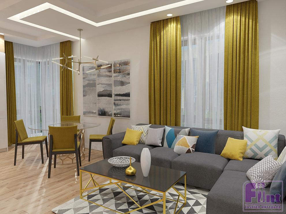 Простые линии и чёткое зонирование дизайнер дополнила яркими акцентами текстиля, комфортной мягкой мебелью и модными «золотыми» элементами декора. Изюминкой же проекта стал горчичный цвет. Он используется как основной для штор и мебельных поверхностей.