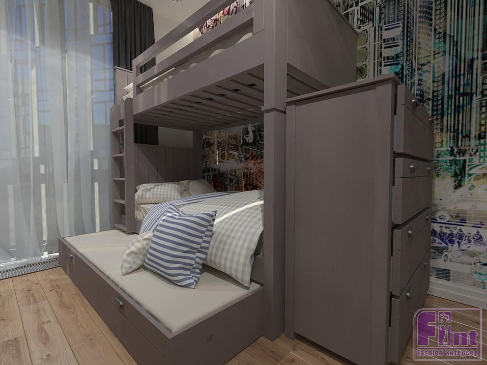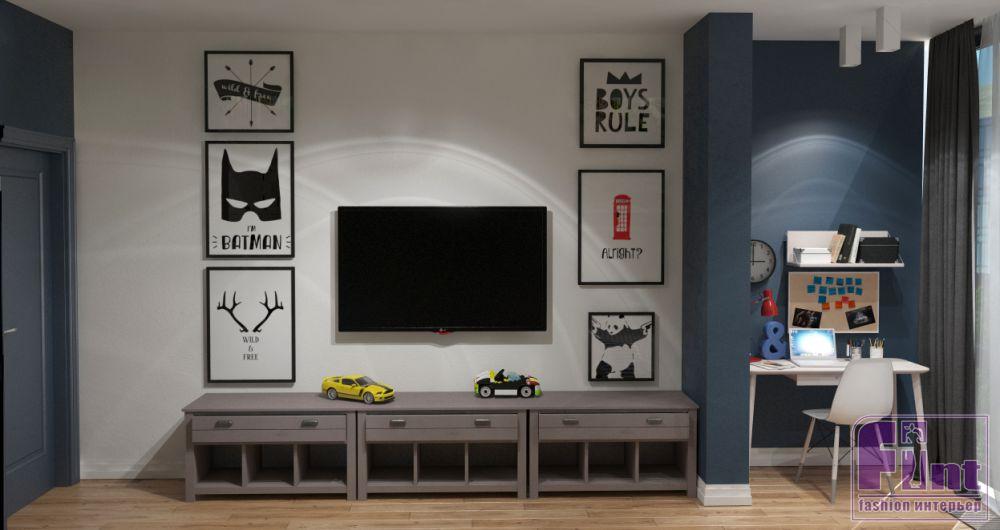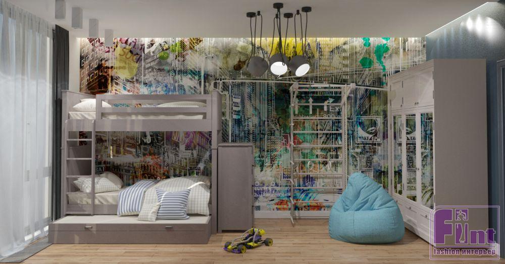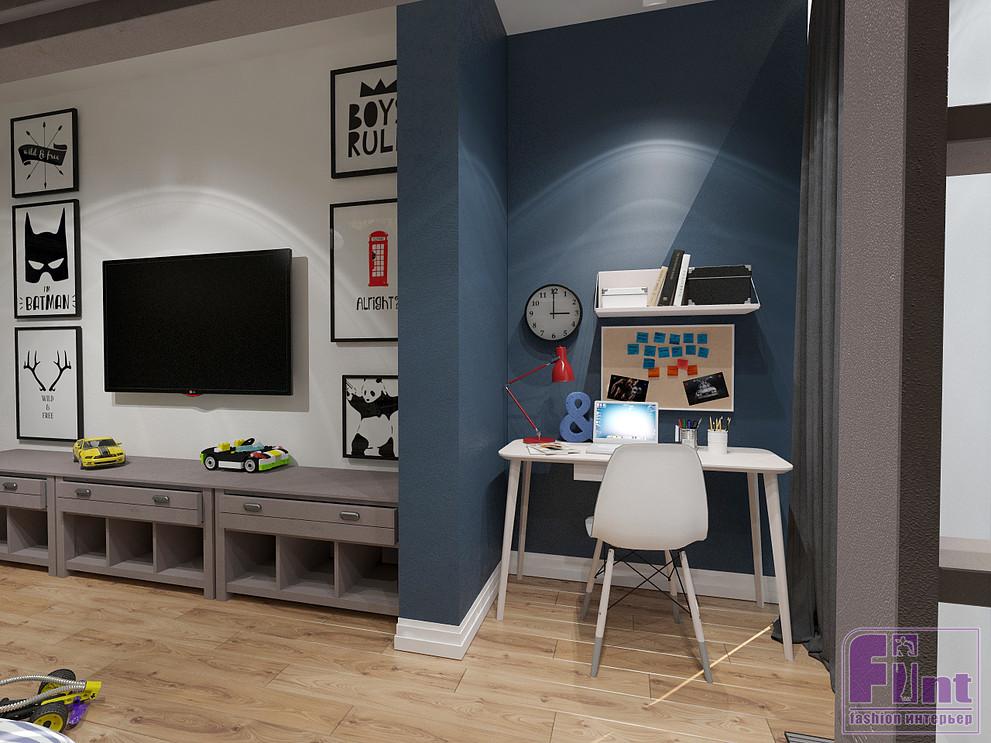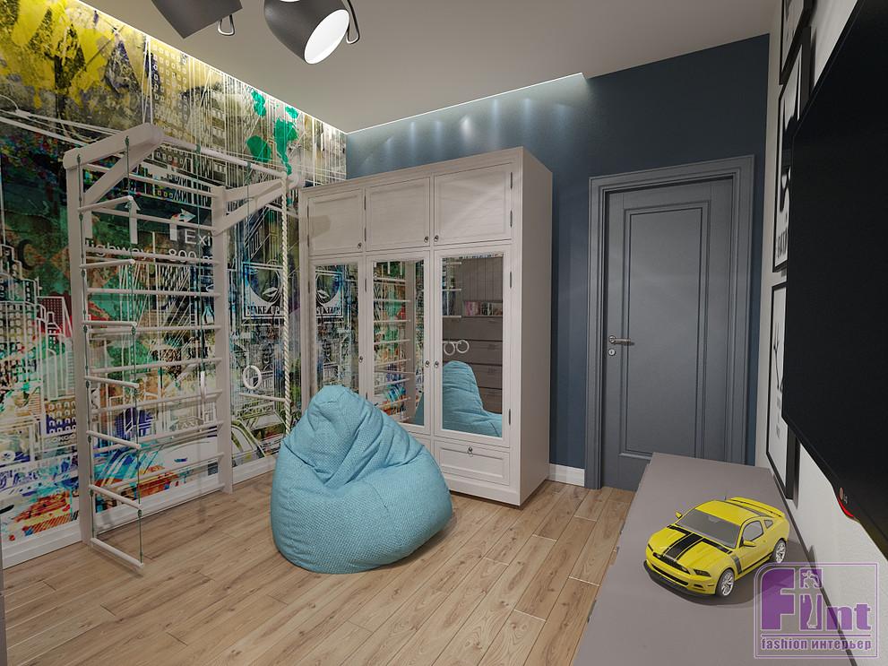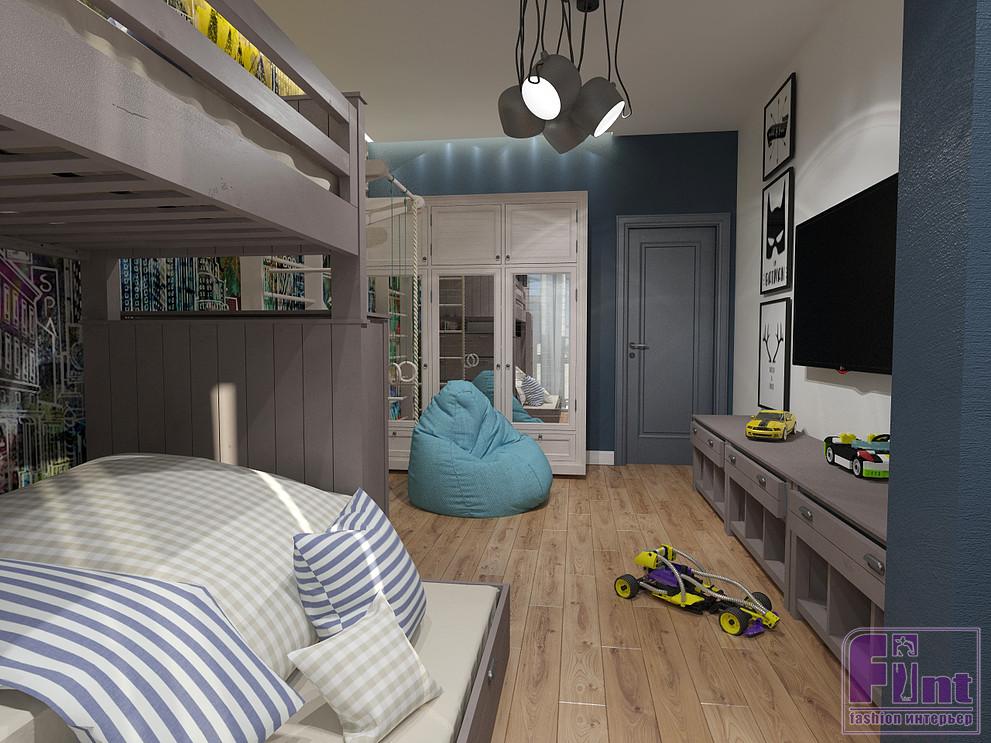 Оригинальное оформление детской комнаты отлично дополняет акцентная стена с графической росписью. В интерьере детской комнаты предусмотрена двухъярусная кровать, спортивный уголок и вместительный шкаф для хранения одежды и игрушек. Акцентным цветом в детской, как и в остальных частях квартиры, стал синий. Рядом с окном дизайнер предусмотрела уютную рабочую зону со столом и навесной полкой.