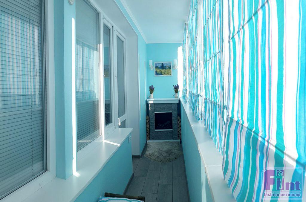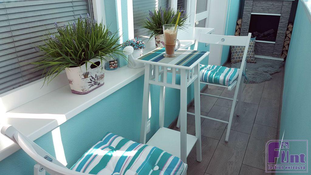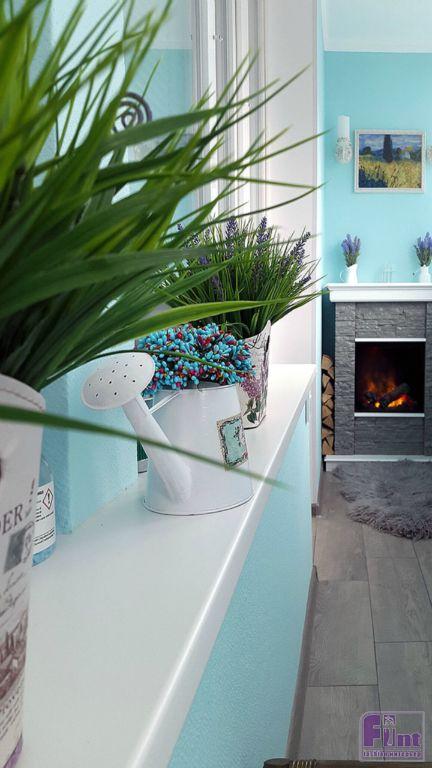 Владелец стандартной двухкомнатной квартиры в Москве решил сделать капитальный ремонт на балконе, чтобы установить на нём камин и обратился к дизайнеру по интерьерам Никите Никитскому за разработкой концепции нового помещения. Никита разработал проект в стиле прованс, который близок по духу всей семье, проживающей в квартире. Помещение было решено выполнить в базовых цветах: бирюзовом и белом, с добавлением ярких акцентов серого, сиреневого и фиолетового.