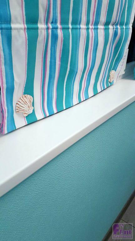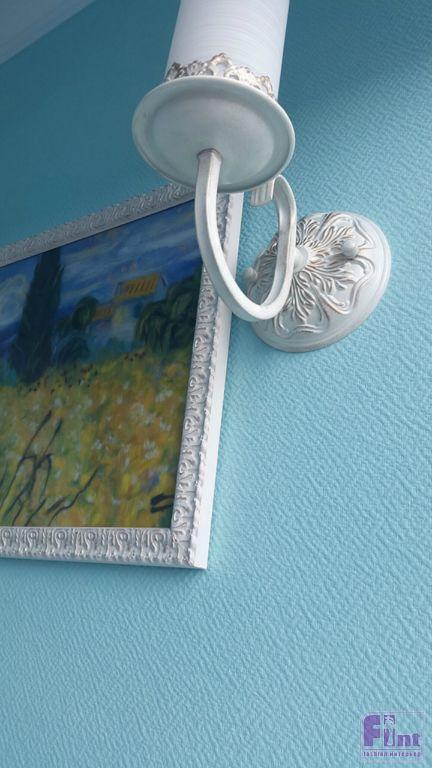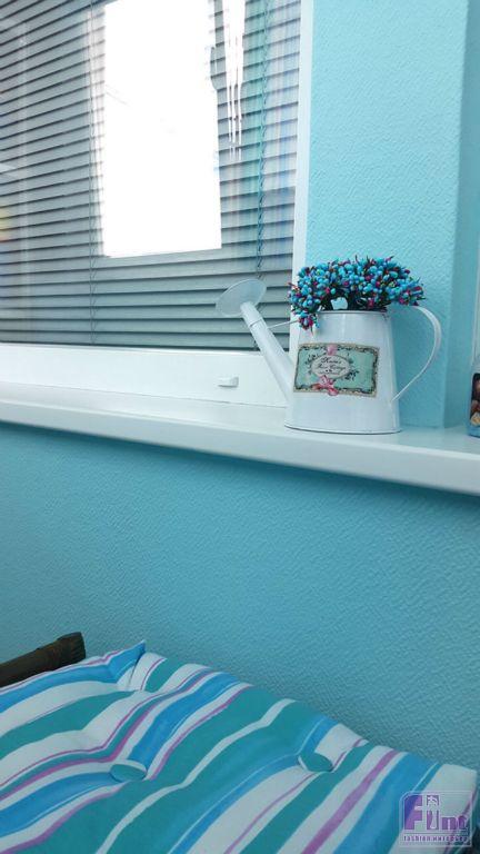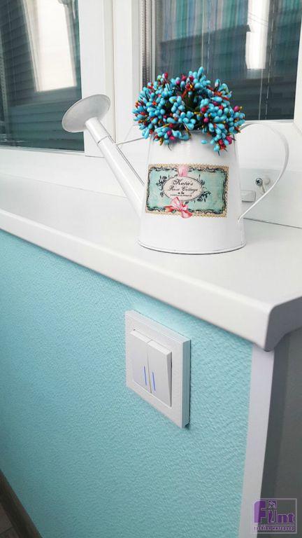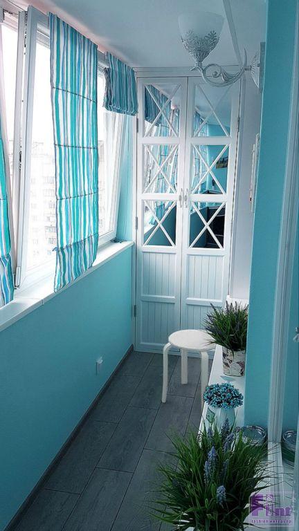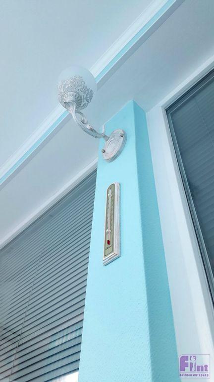 Изначально, владельцы квартиры планировали уложить на пол балкона ламинат, но дизайнер предложил заменить его на аналогичный по стилю и внешнему виду, но более практичный для таких целей керамогранит российского производства. Для финишной отделки стен были использованы стеклообои известного бренда Wellton с мелким фактурным рисунком, имитирующим декоративную штукатурку. Цвет стен – классический для стиля прованс - бирюзовый.