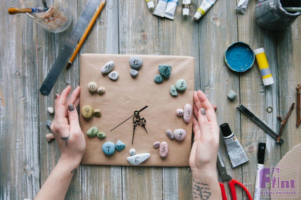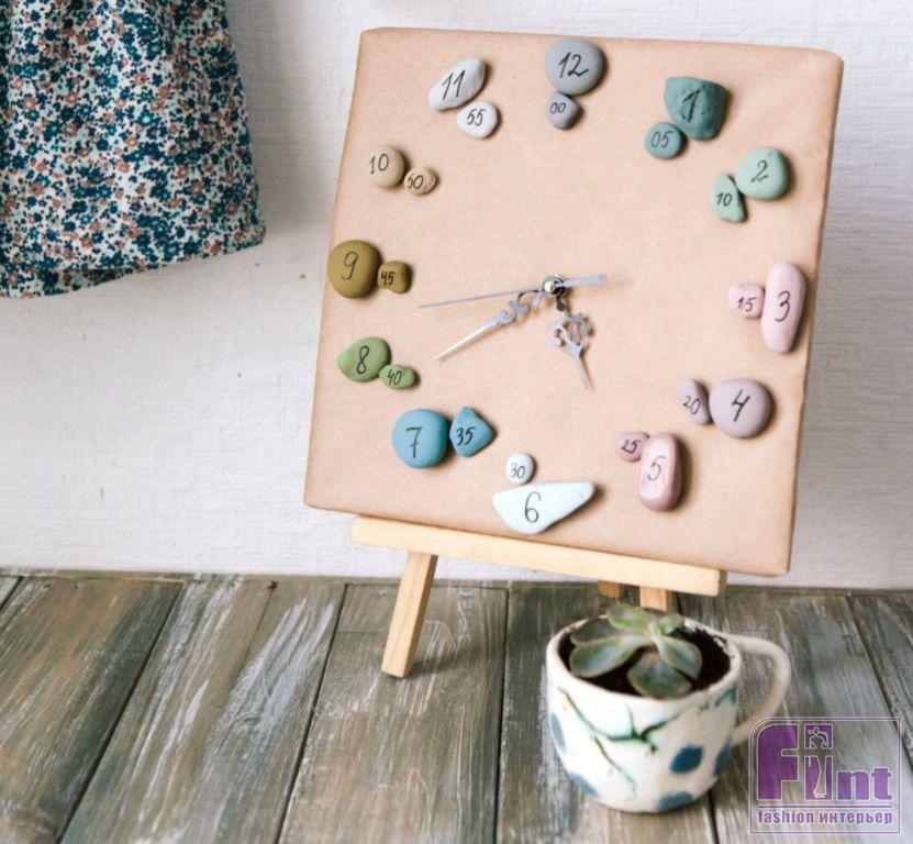 Оригинальные настенные часы своими руками готовы к работе! Осталось повесить их на стену. Как вариант — вы можете поставить их на декоративный пюпитр и использовать в качестве настольных. Кстати, благодаря тому, что все камушки по форме и размеру уникальны, вы можете придать своим часам ещё больше индивидуальности. Подпишите под каждой группой камней название страны, города или пляжа, на котором вы нашли эти камушки и, каждый раз глядя на часы, вы будете невольно вспоминать прекрасные минуты, проведённые в том или ином месте.