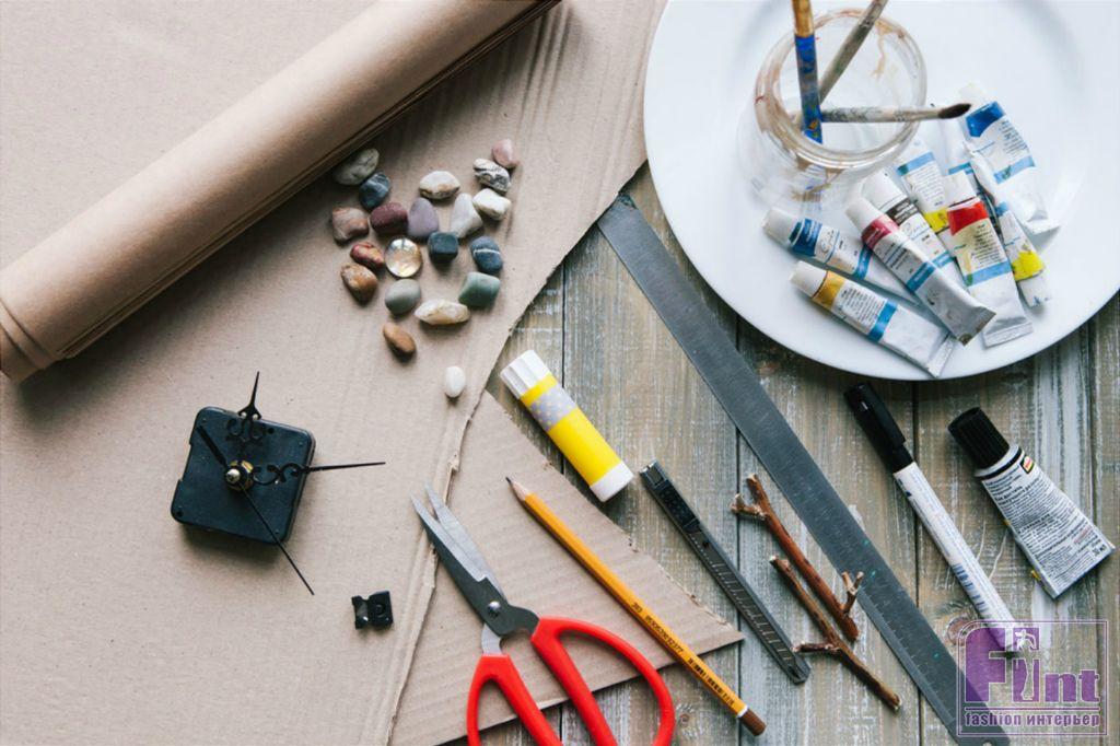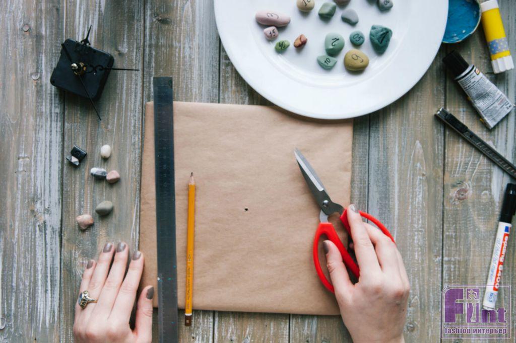 Материалы и инструменты: картон, крафт-бумага, линейка, ножницы; часовой механизм; мелкая галька с пляжа; акриловые краски, кисть, маркер чёрного цвета; быстросохнущий мгновенный клей или клеевой пистолет и канцелярский циркуль.