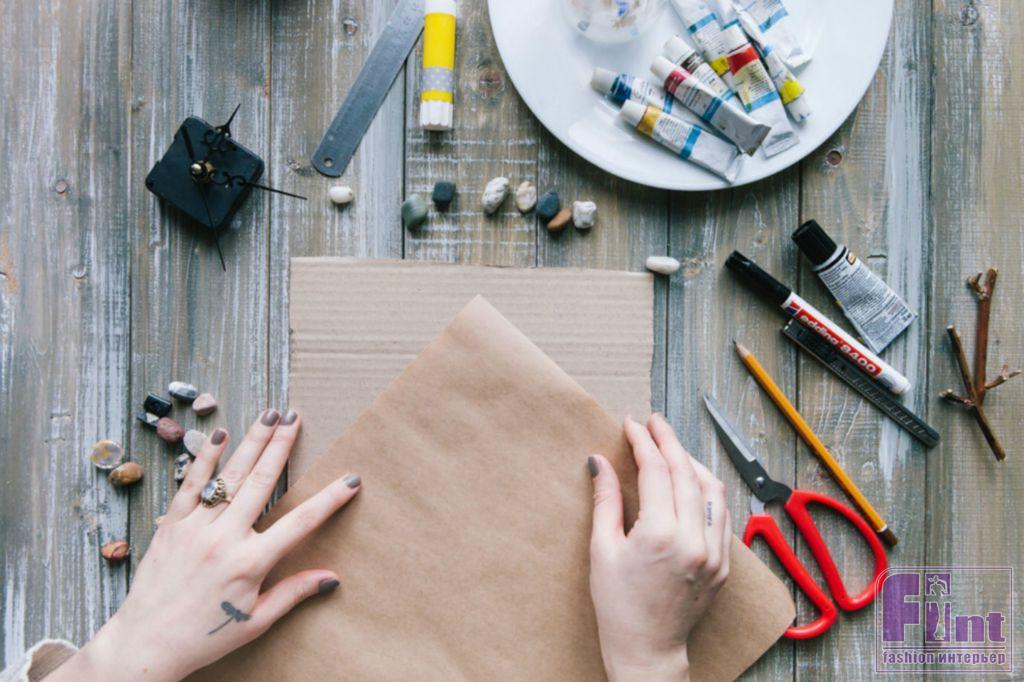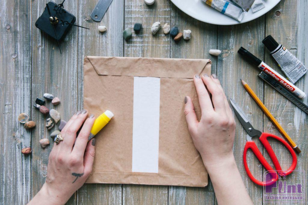 Вырезаем квадратную форму будущих часов и оборачиваем её крафт-бумагой. Как вариант — можно обтянуть картон красивой тканью или яркой упаковочной бумагой. В этом случае, закрепить декоративную «обёртку» можно с помощью двустороннего скотча.