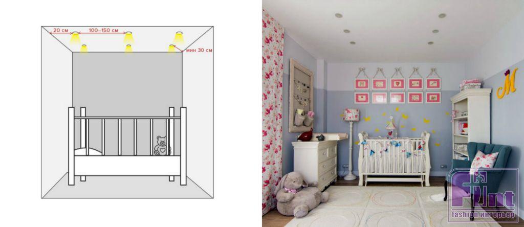 Для общего освещения в детской отдавайте предпочтение спотам – расположенные по периметру потолка, они освещают всю площадь комнаты одинаково хорошо. Дети любят во время игры забираться в самые дальние уголки – даже там они не должны напрягать зрение.