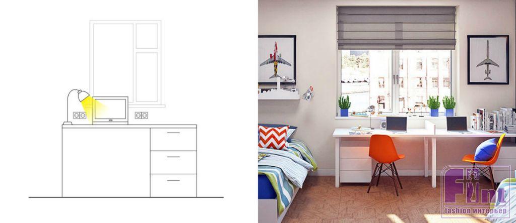 К рабочей зоне родители обычно предъявляют самые строгие требования – и это правильно. Чтобы сохранить хорошее зрение ребёнку, необходимо правильно расположить стол и настольную лампу на нём. Лучше всего организовать рабочее место у окна.