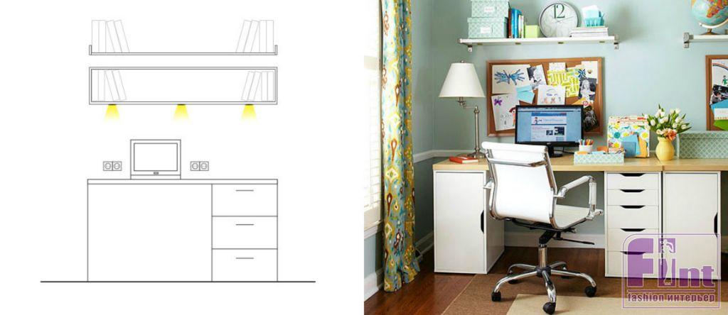 Если над рабочим местом повесить полки, то настольную лампу можно заменить на ряд точечных светильников в их нижней части – они дадут равномерный рассеянный свет.