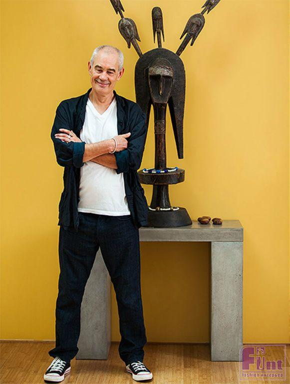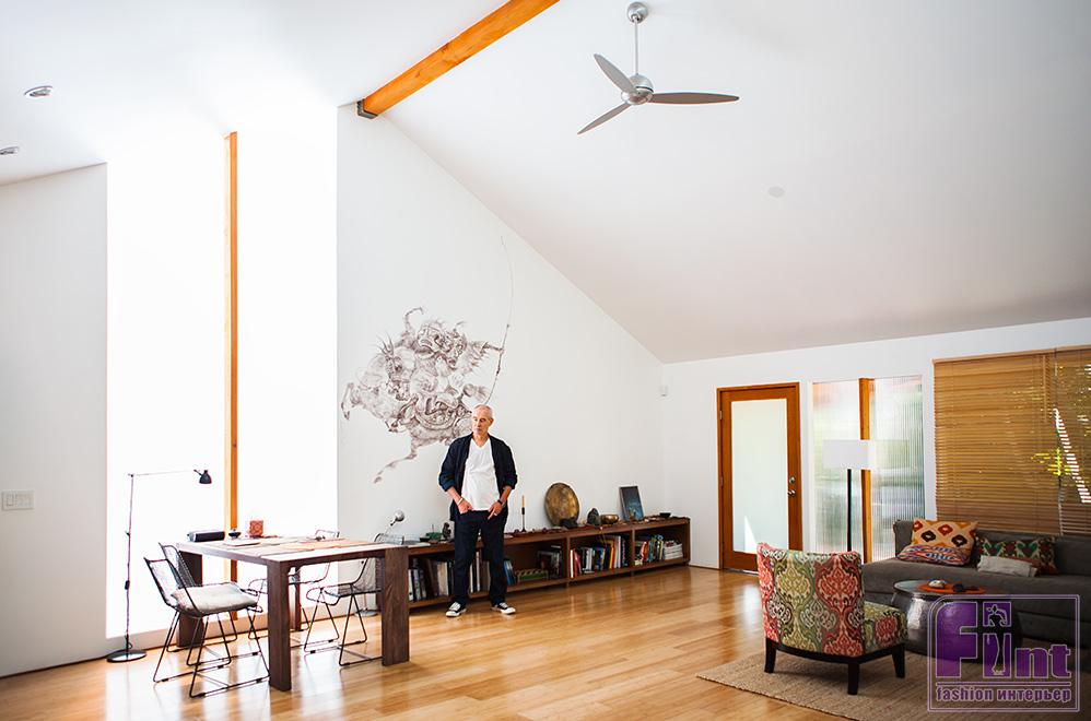 Простой, но вместе с тем, уютный интерьер дома Сергея Бодрова дополнен яркими этническими аксессуарами и деталями интерьера. Это и культовые индейские маски, и красочный народный текстиль, и марокканские подушки на огромном диване и даже индейский тотем, установленный на стильном бетонном постаменте.