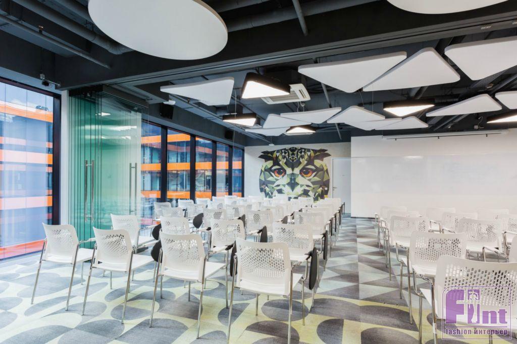 В центре офиса выделено две большие зоны для проведения презентаций. В них установлены диваны, столы и штабелируемые стулья. Здесь же предусмотрены игровая зона, кухня, комната для собраний, лаунж, большие и маленькие переговорные, комнаты для телефонных разговоров и рабочие пространства.