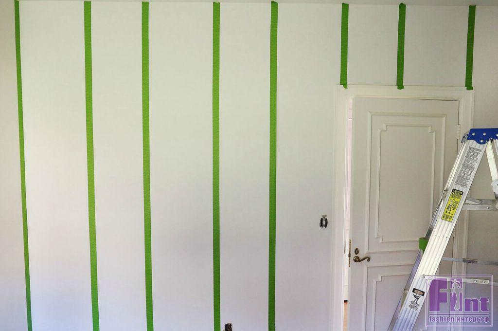 Шаг 2. Чтобы получить ровные вертикальные полосы, сначала разметьте стену по ширине у потолка. Затем, используя отвес или уровень, сделайте несколько отметок посередине и внизу стены. По этим отметкам аккуратно прочертите линии и наклейте малярный скотч таким образом, чтобы он позволял нам окрашивать за один раз полоски через одну, начиная с первой от угла.