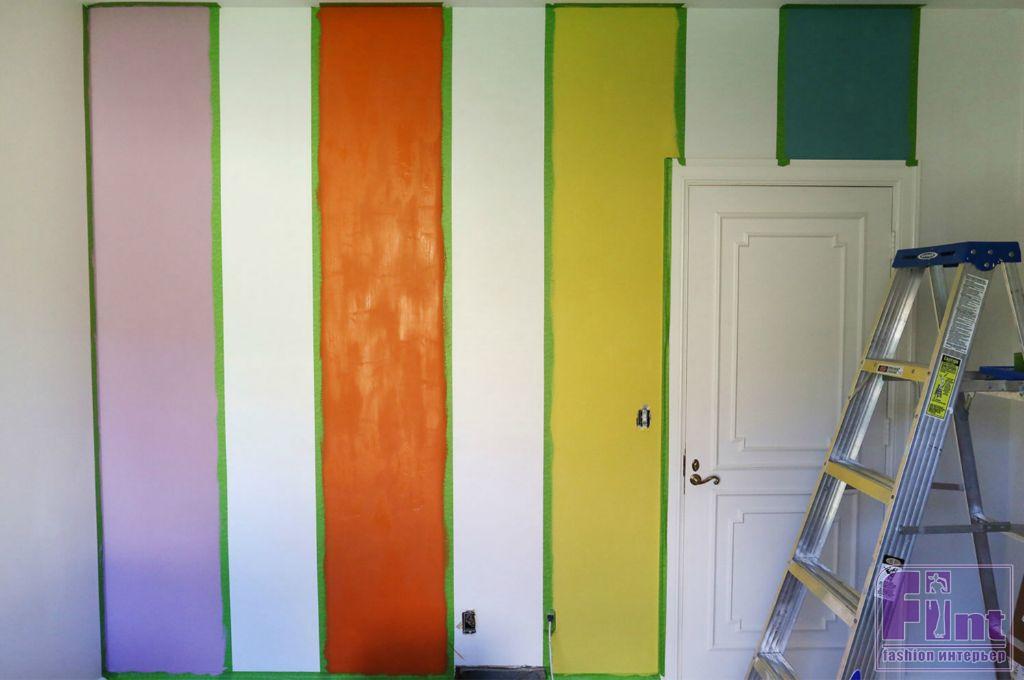 Шаг 4. На следующий день можно приступать к окрашиванию тех полосок, которые мы пропустили накануне. Заклейте малярным скотчем линии соприкосновения так, чтобы открытыми оставались неокрашенные части. Далее необходимо применить один важный секрет профессиональных маляров – трафаретную технику. Суть её заключается в том, чтобы получить очень ровную и чёткую линию перехода цвета без подтёков, которые могут случиться, если просто начать красить полоски в свои цвета. Поэтому, после того, как будет наклеен малярный скотч, прокрасьте края ранее неокрашенных полос в цвета соседних полос и дайте краске подсохнуть. После высыхания краски, можно брать цвет, который мы выбрали для данной полосы, и прокрашивать полосу, закрашивая сделанные предварительные прокрасы. С помощью такой техники окрашивания мы добьёмся очень ровной линии стыка двух красок.