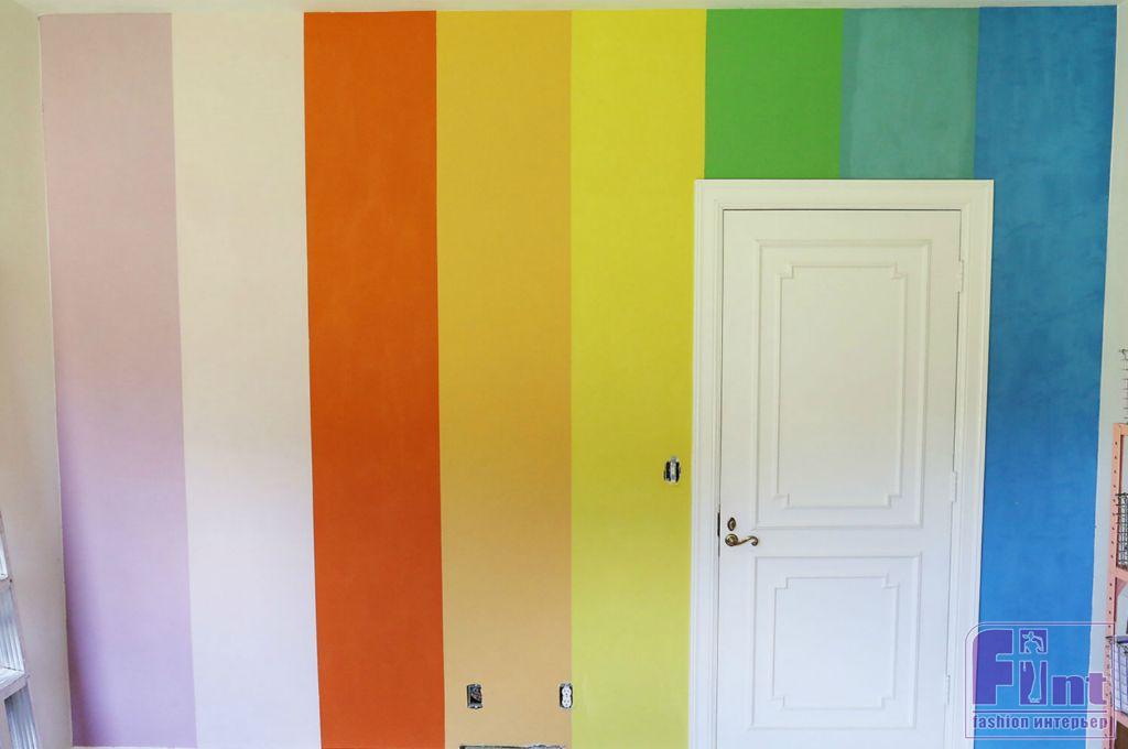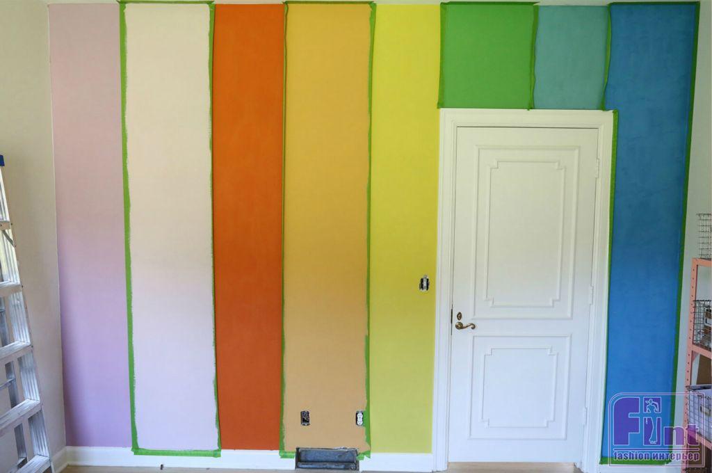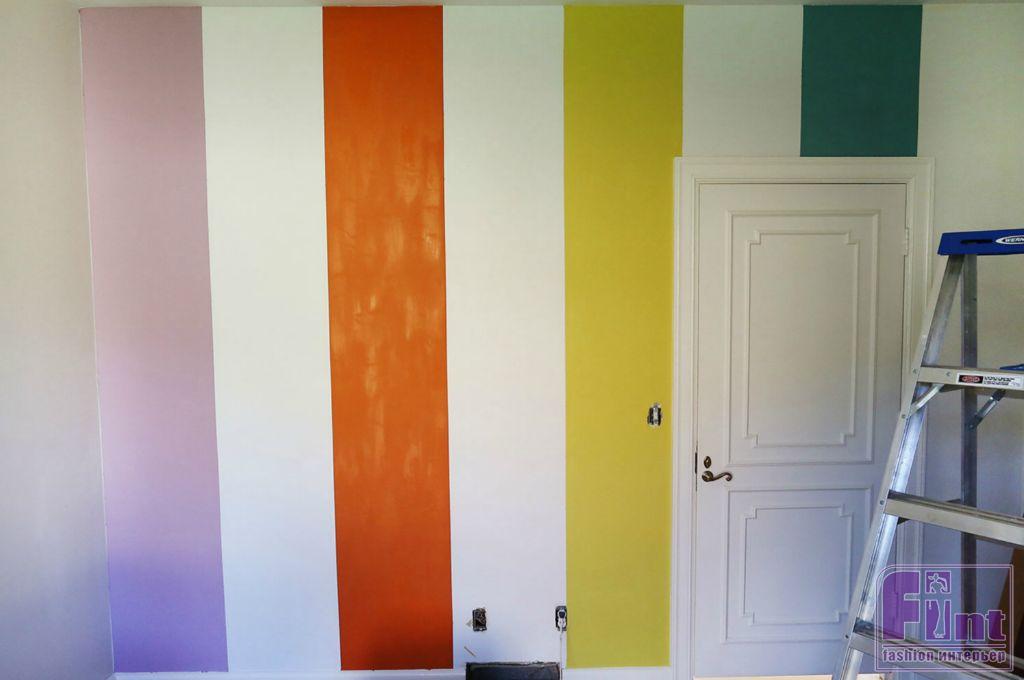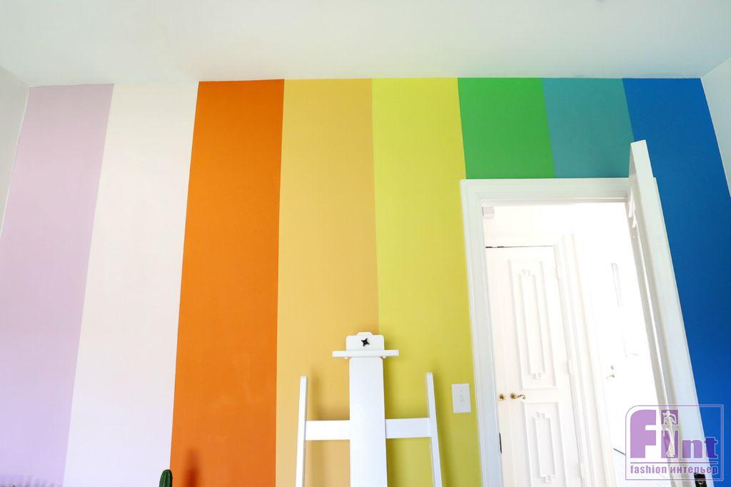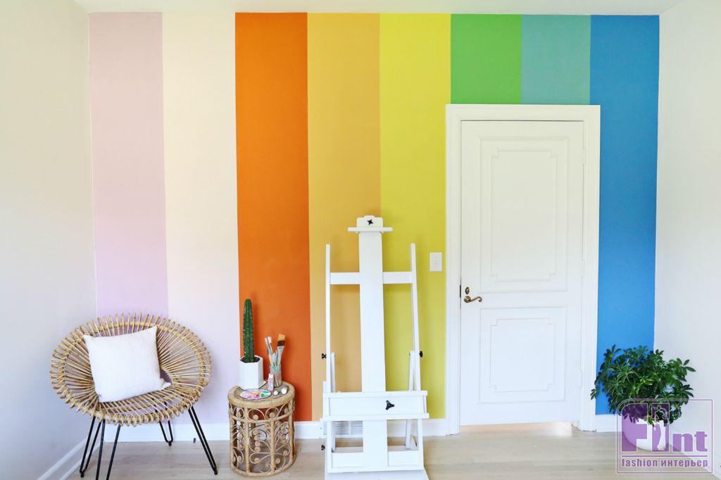 Радужная раскраска стены выбрана нами не случайно. Ведь белый цвет – это и есть радуга, соединённая в одно целое. Если же пропустить белый свет через призму, он разделится на всем известные цвета радуги. Ещё одним из доводов в пользу радужной акцентной стены стало желание сделать помещение максимально ярким и жизнерадостным. Вы же, используя технологию трафаретного нанесения орнамента «полоски» можете использовать любые цвета, гармонирующие с основным цветом вашего интерьера.