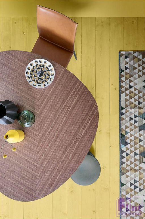 Стол Tweed дизайнеров Виченте Гарсии и Алессандры Кумини, созданный для компании Zanotta, демонстрирует, как типичные текстильные узоры можно использовать на других предметах мебели. Здесь прямые линии, напоминающие твид, создают приятный контраст с мягким изгибом стола. Линия, где полоски узора образуют прямой угол, перекликаются с треугольниками на ковре.