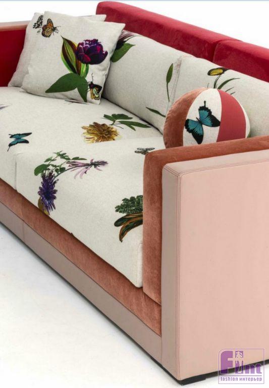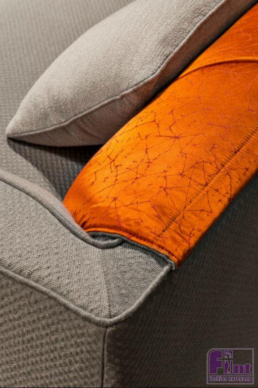 Спинка этого дивана от Rubelli меняет цвет — она двусторонняя. С одной стороны она такая же, как весь диван, но её можно перевернуть другой, ярко-оранжевой стороной.