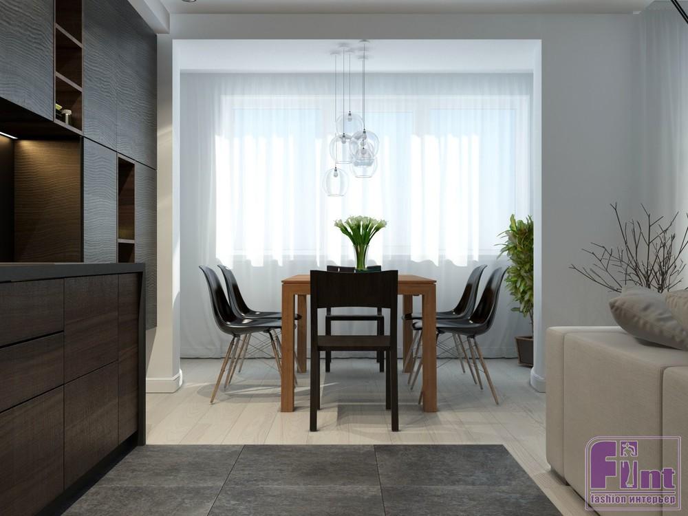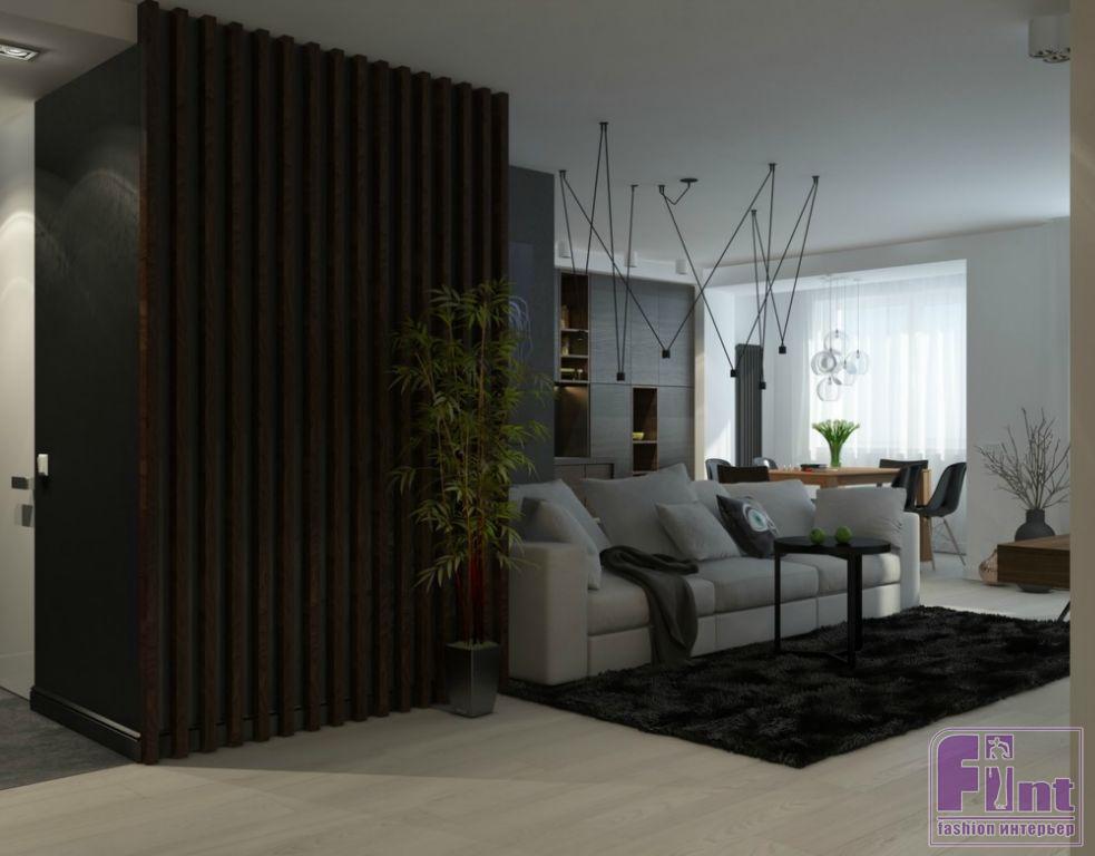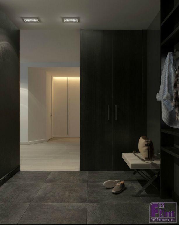Тёмные тона, которым отдали предпочтения хозяева квартиры, погружают в атмосферу спокойствия уже с самого входа в квартиру. Прихожая наполнена мягким тоном серо-коричневого оттенка, который формируется фасадами встроенных шкафов. Переход из прихожей в квартиру выполнен на контрасте с ярким белым цветом крашеных стен.