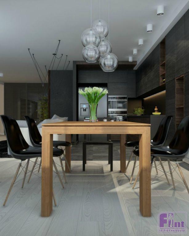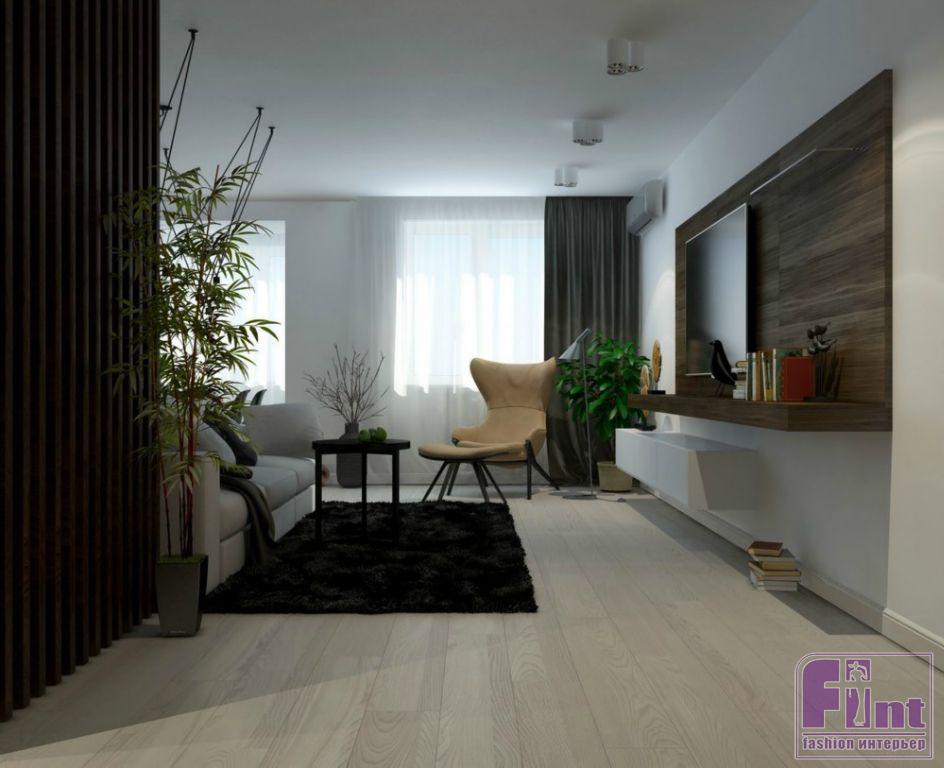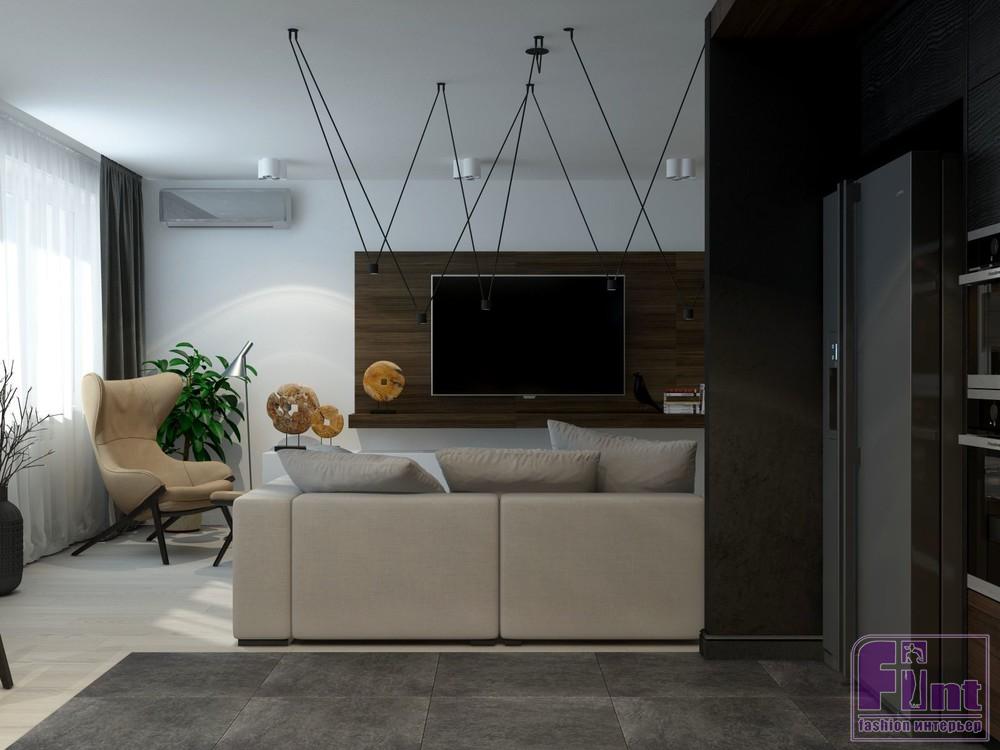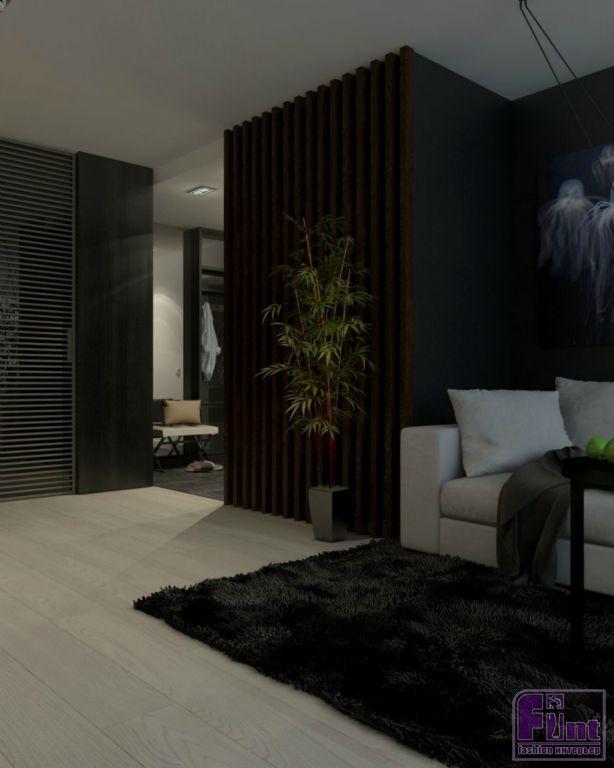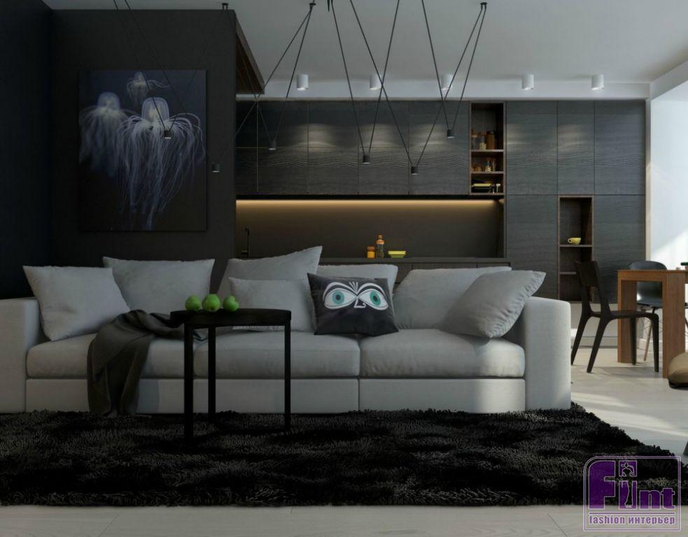 Важное место в работе над оформлением квартиры было уделено созданию атмосферы уюта и покоя. Отсюда — обилие темных тонов, способствующих релаксации после напряженного дня, и дерева, дающего необходимое ощущение теплоты. Центром квартиры стала гостиная, для посиделок в которой выбрано дизайнерское кресло с пуфом. Облик общественной зоны дополнил тематический постер с изображением медуз. Общественная зона хорошо освещена — в дополнение к искусственному освещению, через большие окна проникает достаточное количество естественного света.