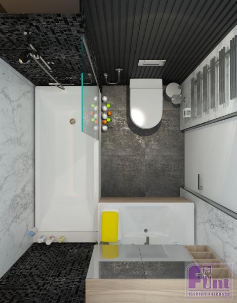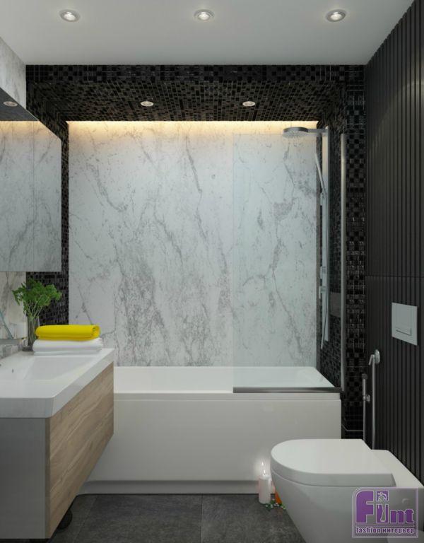 Современный санузел выглядит очень динамично, благодаря сочетанию различных цветов и фактур. Относительно небольшой по размеру санузел, тем не менее, вместил в себя все необходимые аксессуары, включая полноформатную ванную со стеклянной ширмой.