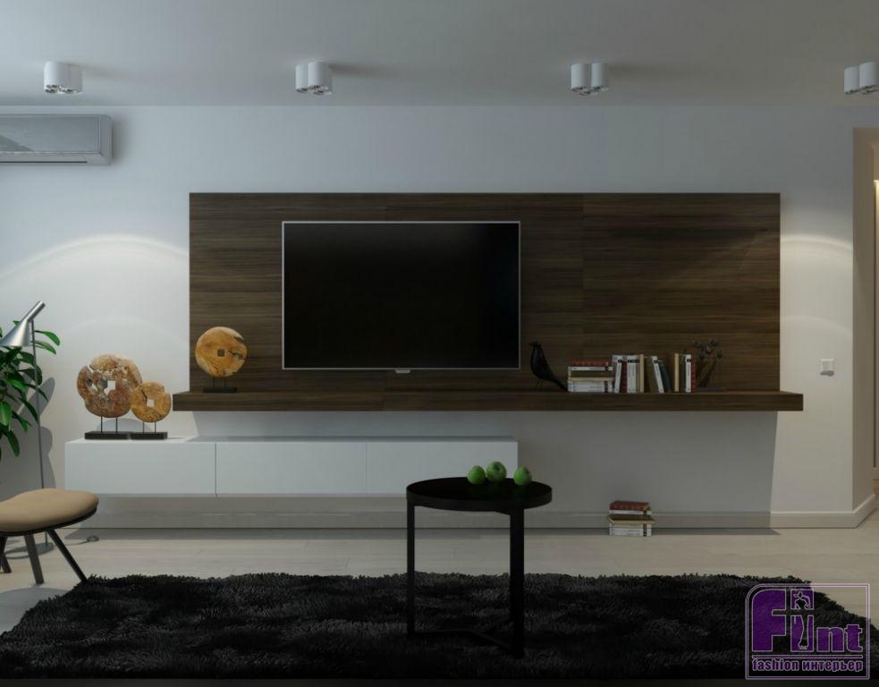 Общественная зона дополнена зоной ТВ, которая решена с использованием натурального дерева тёмного оттенка. Такая отделка природным деревом придаёт интерьеру особый уют. Освещение общественной зоны и зоны ТВ решено посредством основного и дополнительных точечных источников света, которые создают необходимое в этом многофункциональном помещении зонирование.