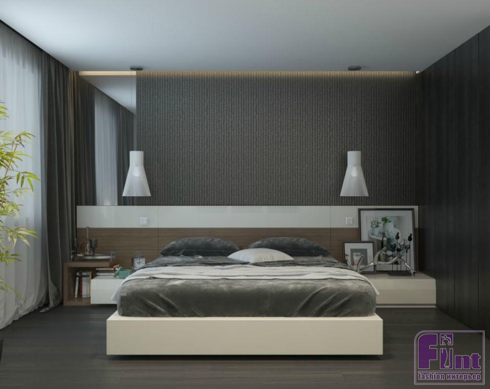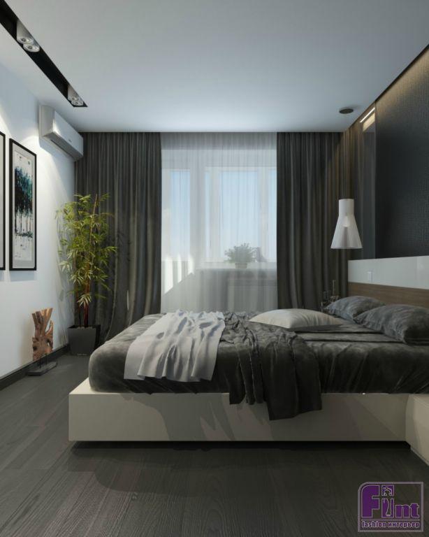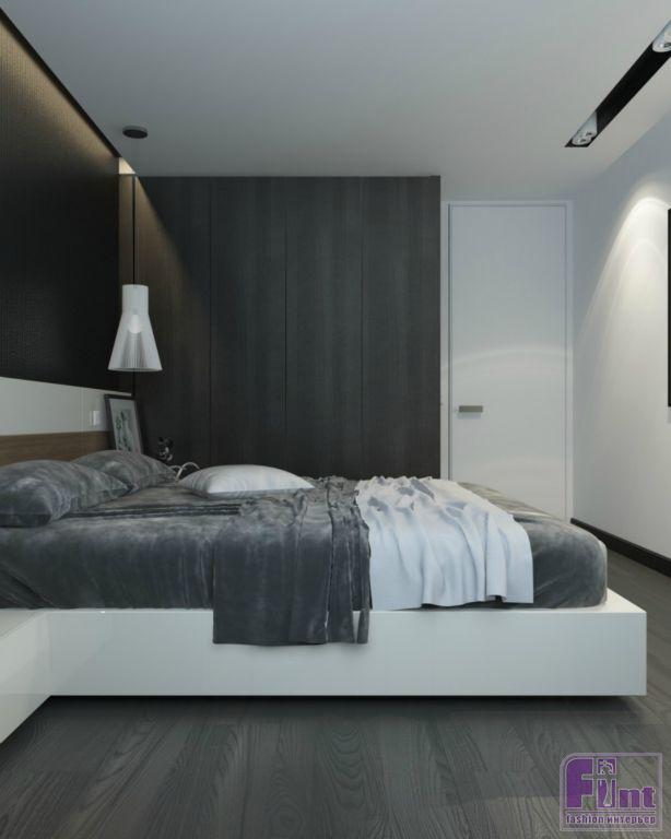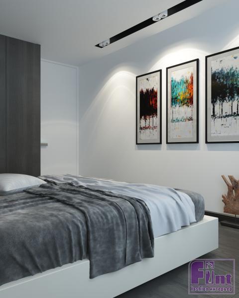 Основным цветом спальни хозяев стал глубокий серый. Цветовую тему спальни прекрасно подчёркивает текстиль, идеально подобранный по тону к стенам и мебели. Разбавляет цветовую гамму хозяйской спальни белая крашеная акцентная стена с размещёнными на ней яркими постерами.