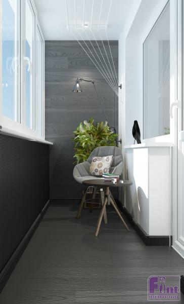 Основные помещения квартиры дополнены лаконичной зоной отдыха, в которую дизайнер превратила балкон квартиры. На небольшом пространстве удалось разместить уютное кресло с компактным журнальным столиком. Отделка стен на балконе повторяет основное стилевое решение квартиры: тёмные основные стены и яркая акцентная стена.